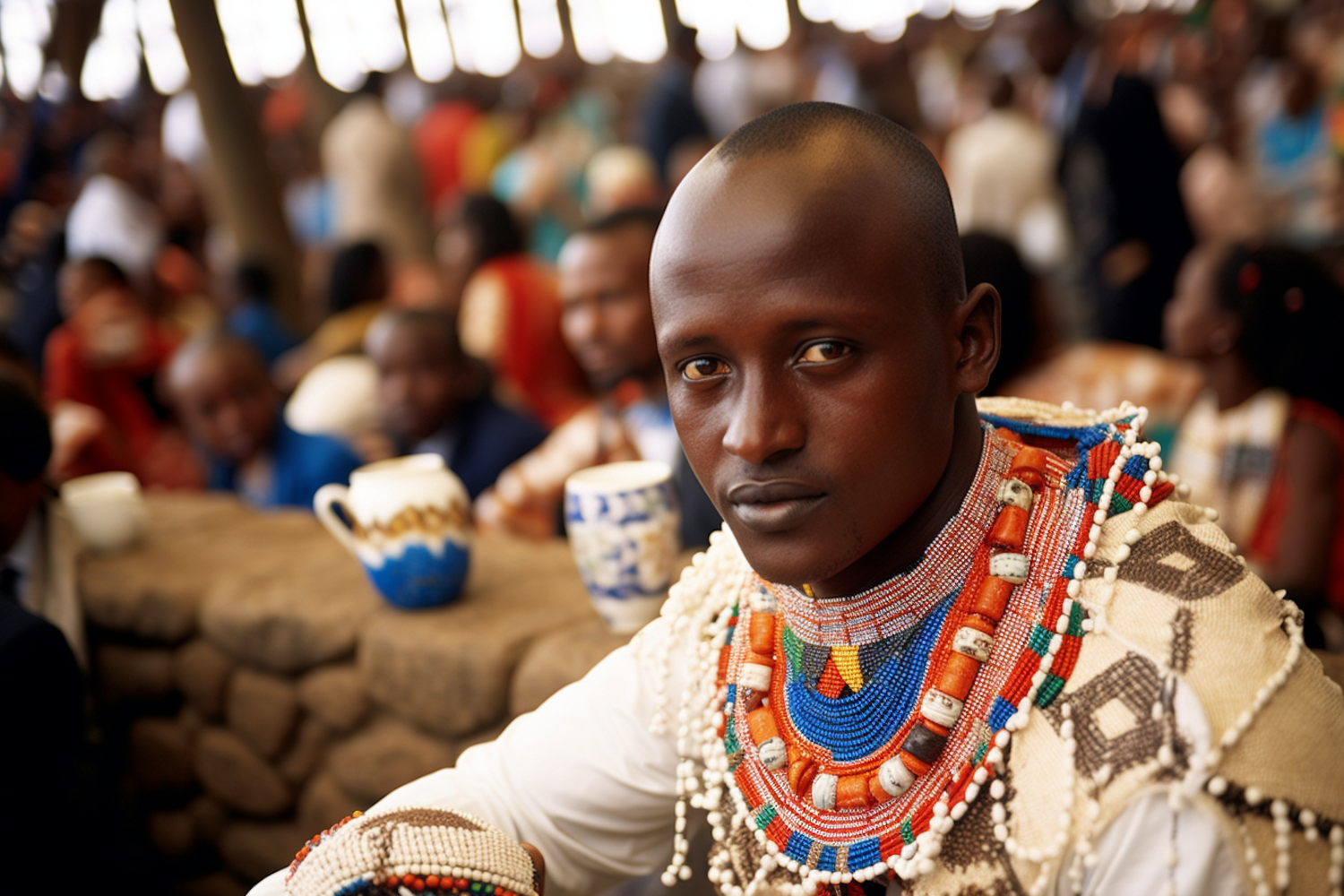 Young man in traditional Maasai attire with colorful beads at a cultural gathering, surrounded by a lively crowd.