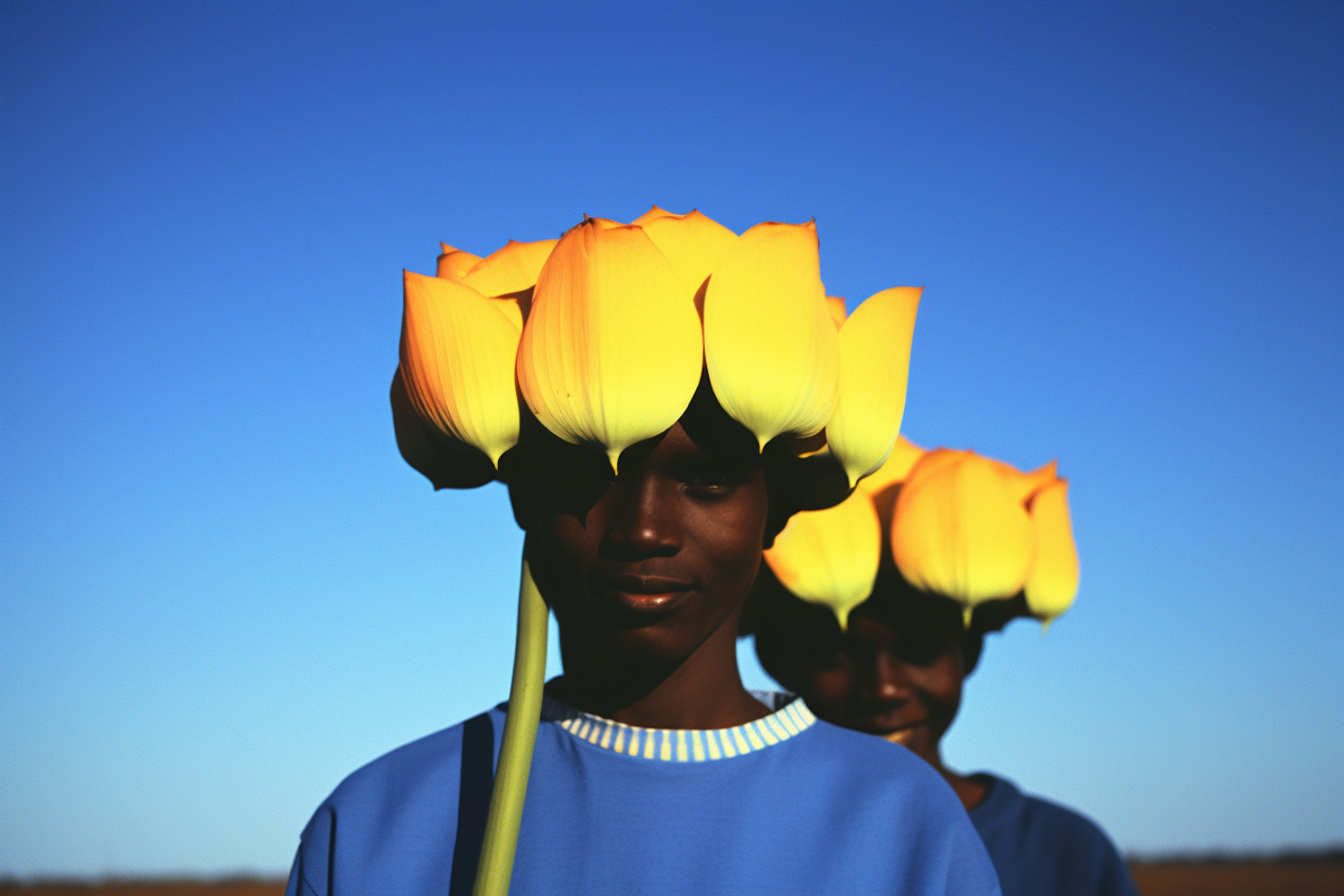 Two individuals wear crowns of yellow tulip petals against a clear blue sky, creating a vibrant and imaginative scene.