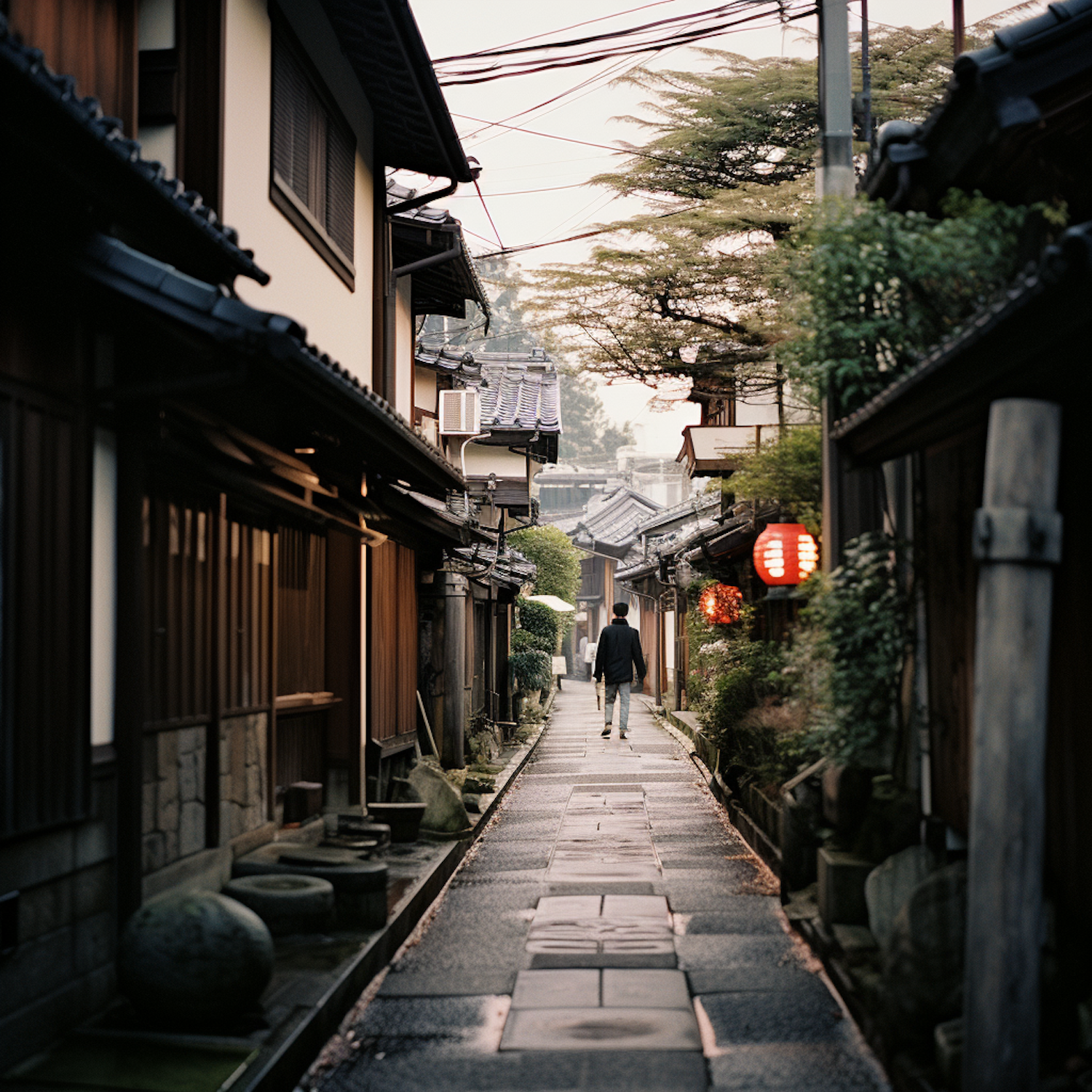 Serene Japanese alley with traditional wooden houses, stone path, and a red lantern. A person walks away, enhancing the tranquil vibe.