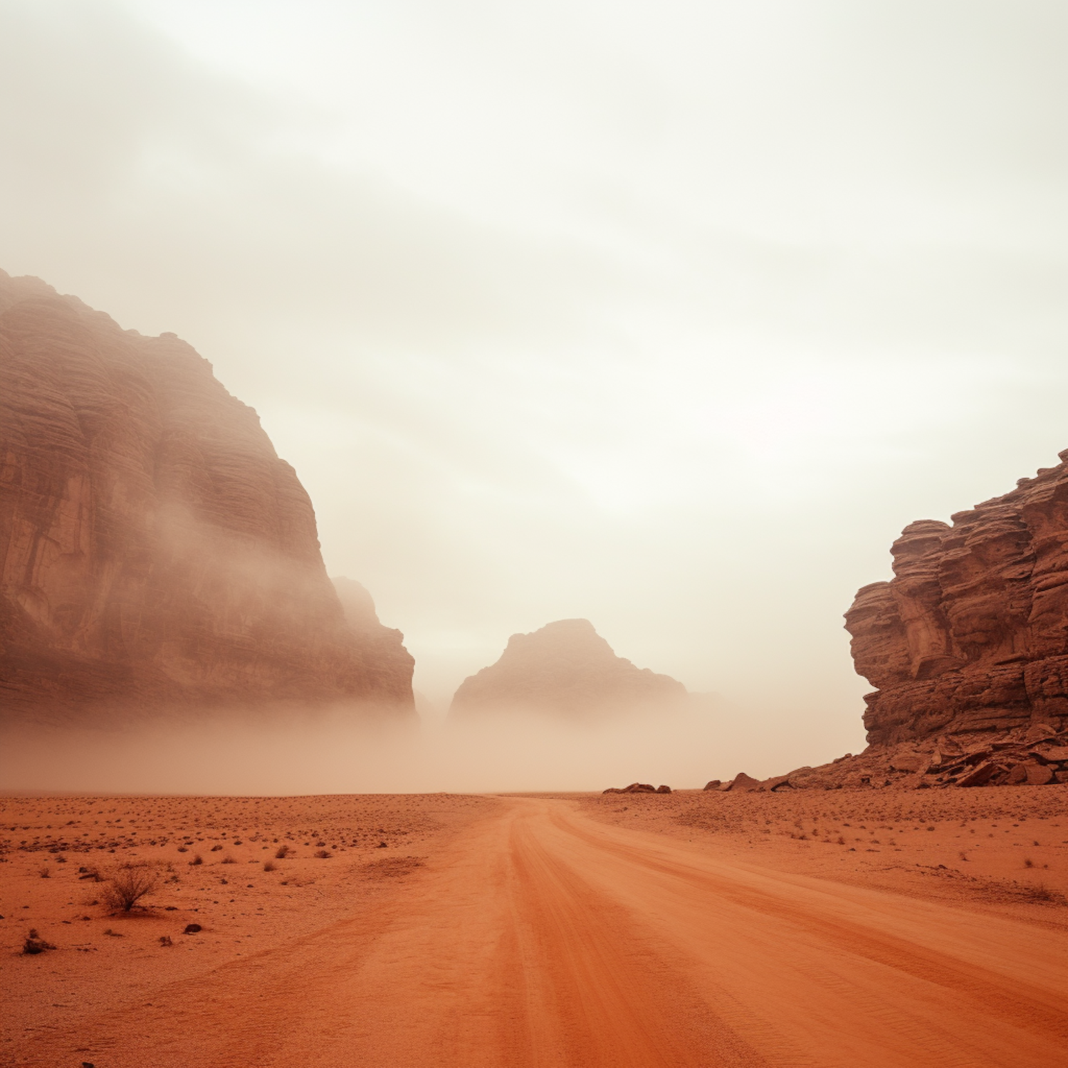 Vast desert landscape with towering rock formations and a winding dusty road under an overcast sky, evoking isolation and timelessness.