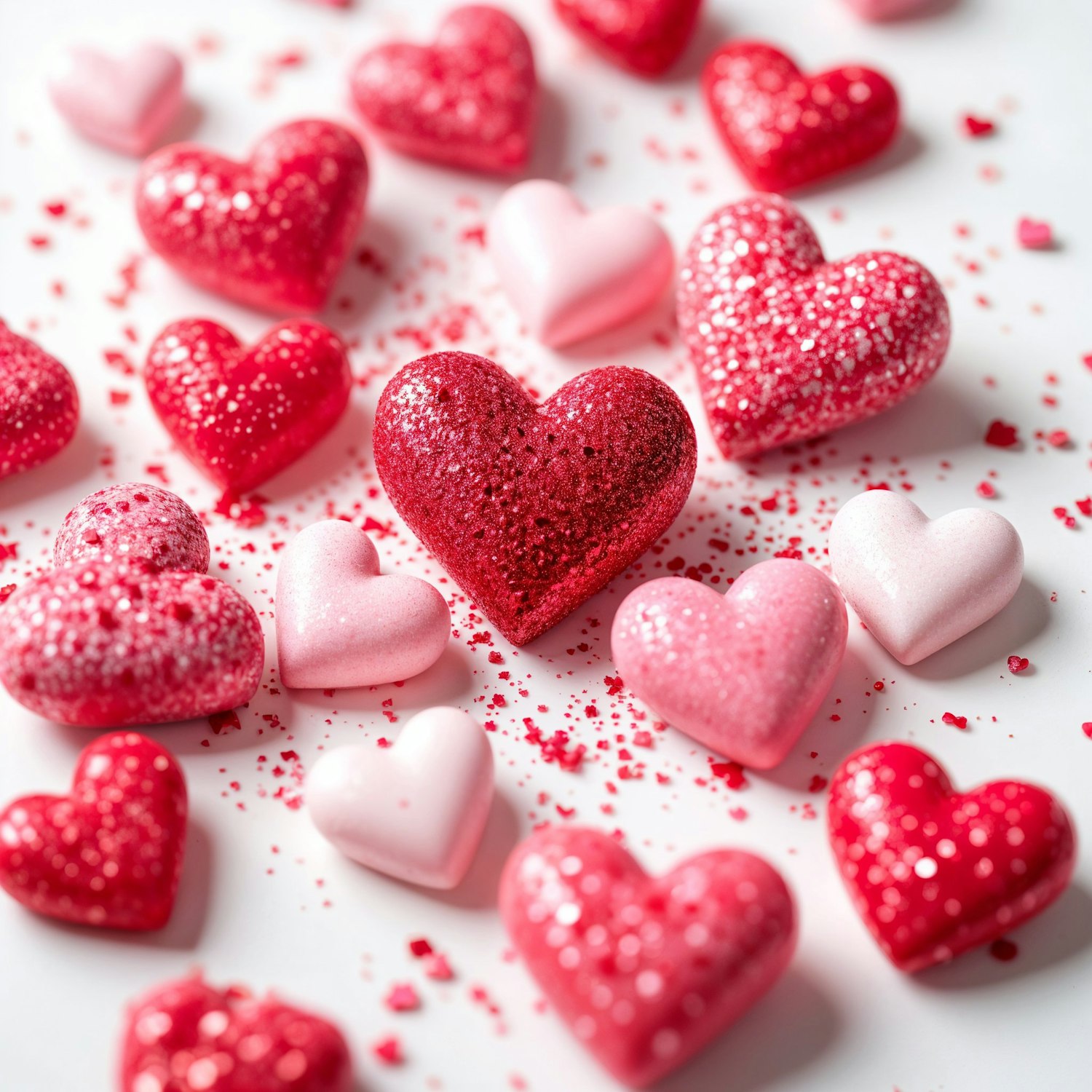 Glittery red and pink heart decorations with confetti on a white surface, creating a festive and romantic Valentine's Day vibe.