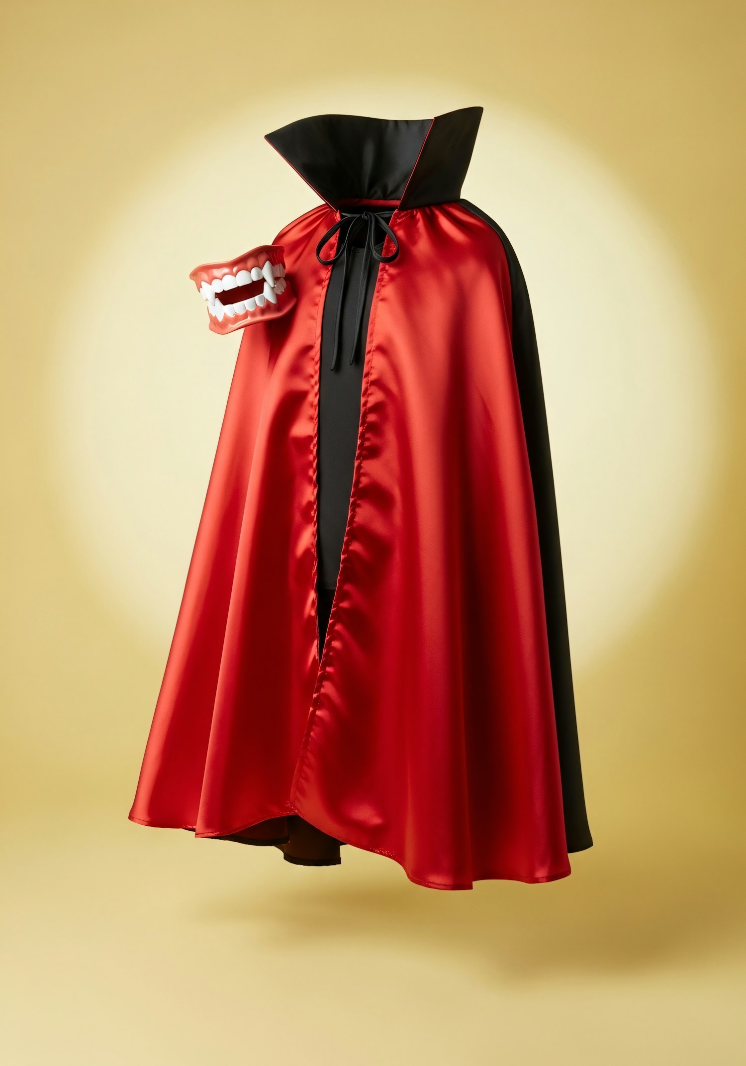 A red and black satin cape with a high collar and vampire fangs, set against a yellow background, perfect for a Halloween costume.