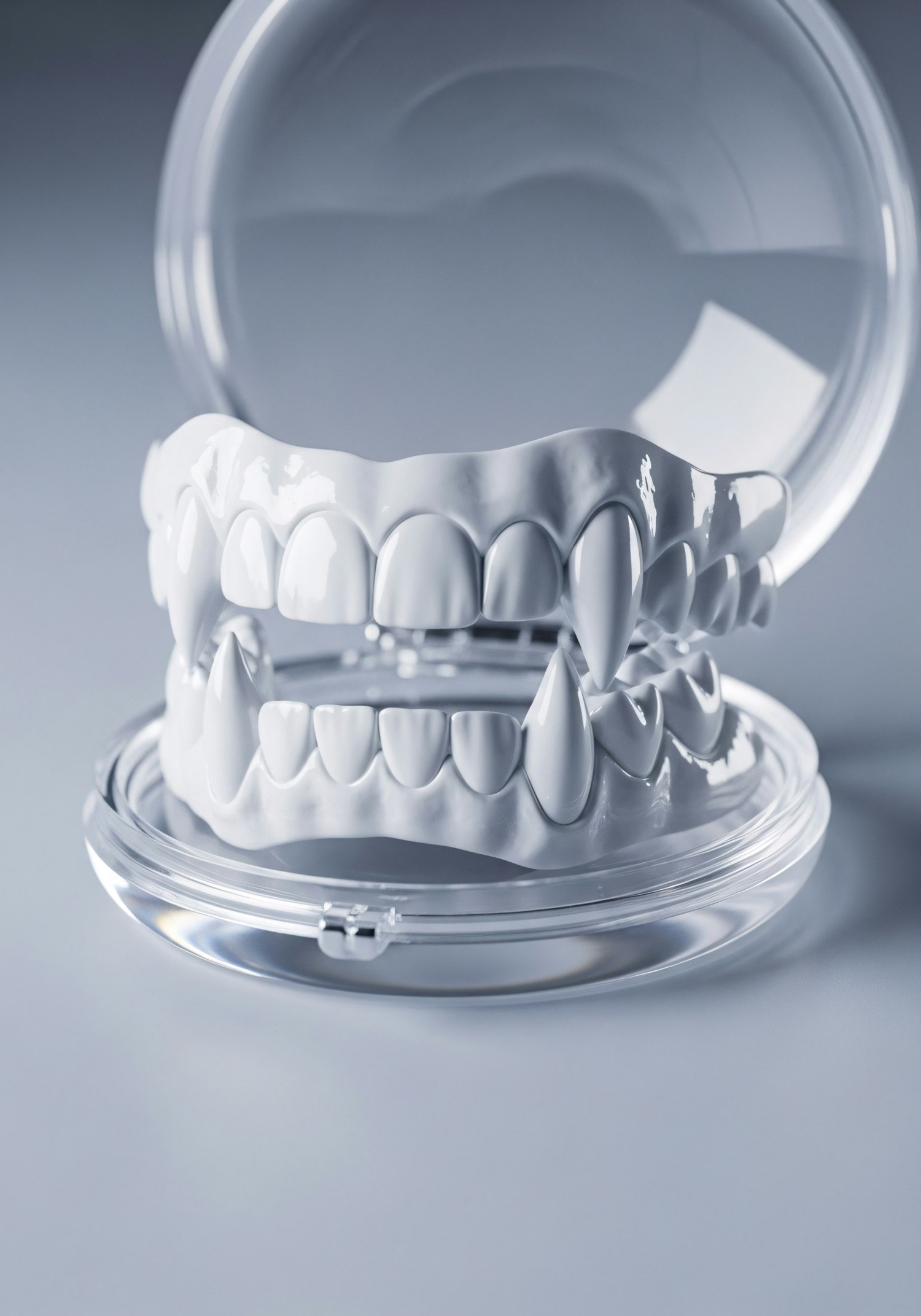 A detailed close-up of white vampire teeth in a clear case, showcasing their sharp fangs and glossy finish against a neutral background.