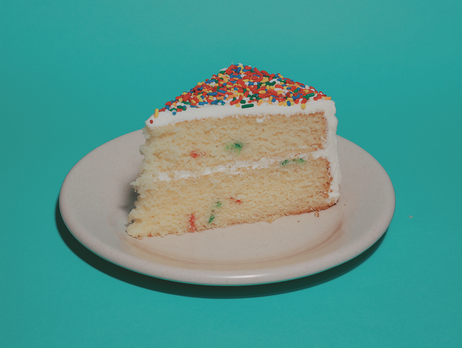 Slice of vanilla plated cake with white frosting and sprinkles, served on a white plate with teal backdrop.