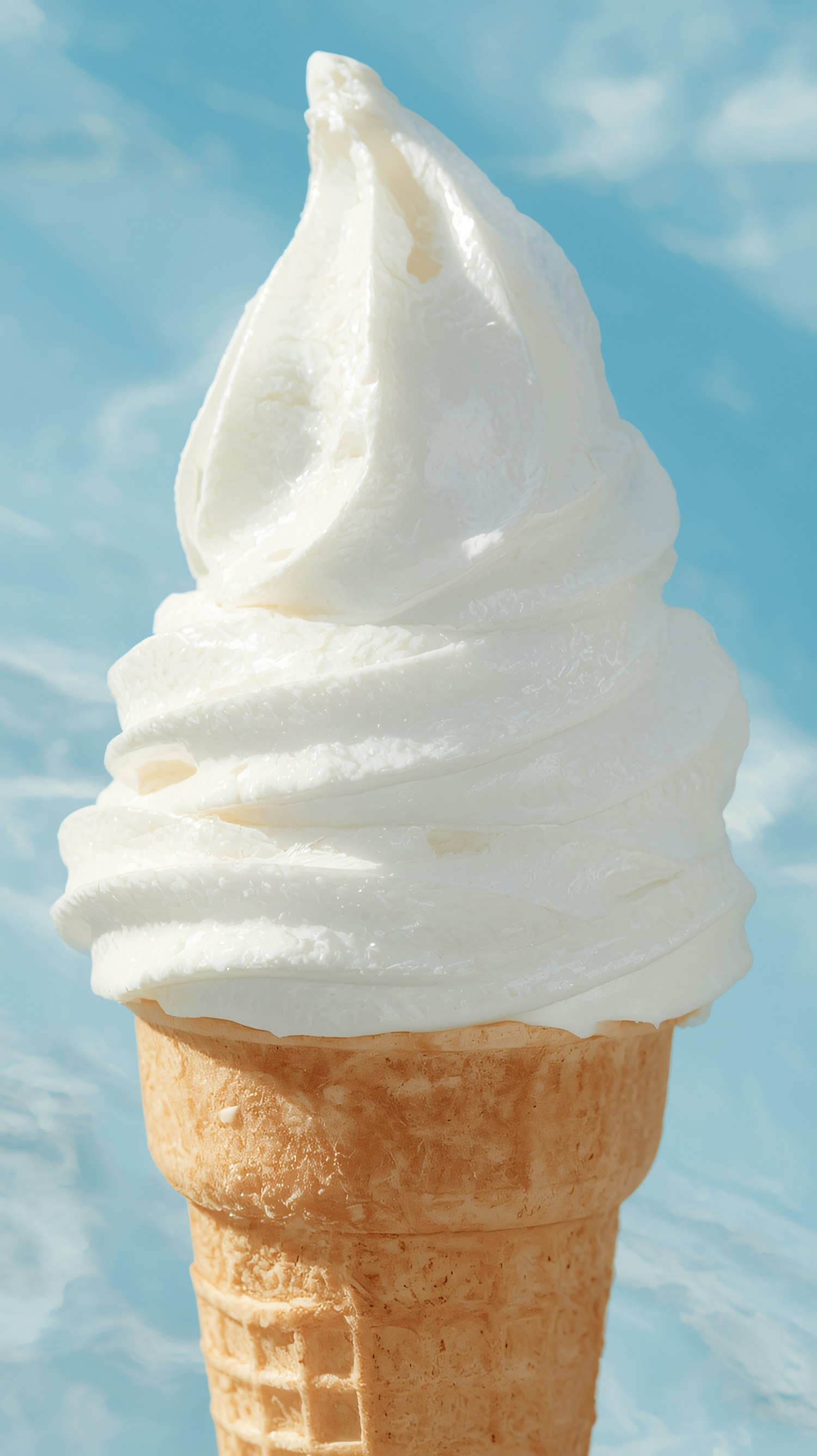 A creamy vanilla soft-serve ice cream in a waffle cone, set against a bright blue sky with soft clouds, evoking a summery vibe.