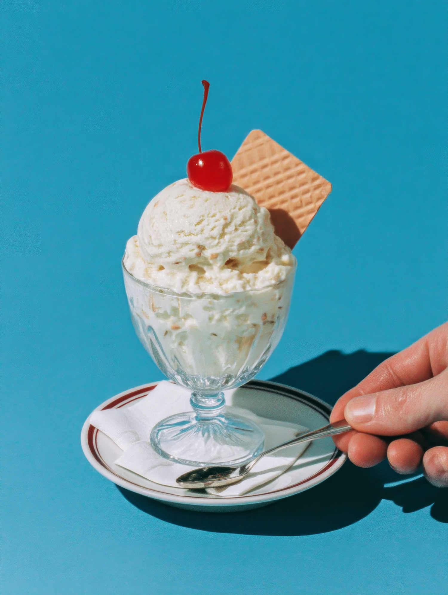 A delicious vanilla ice cream sundae with a cherry and wafer, served in a glass cup on a plate with a spoon, against a blue background.