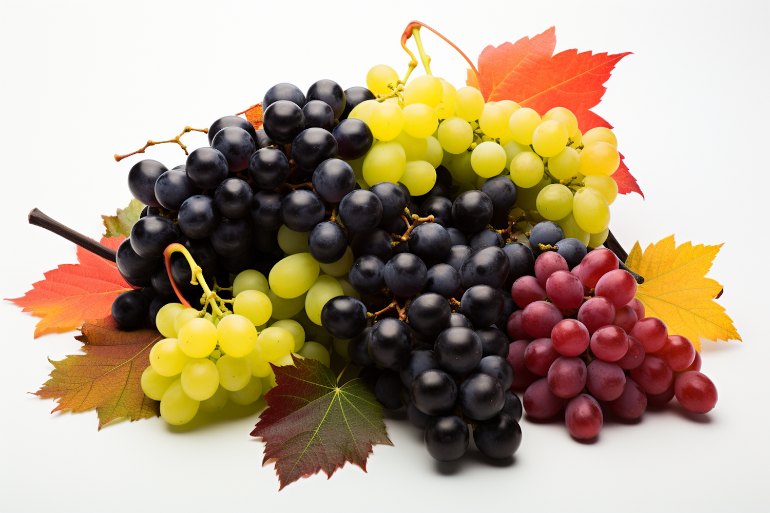 A colorful assortment of black, green, and red grapes with autumn leaves, showcasing a vibrant and fresh display.