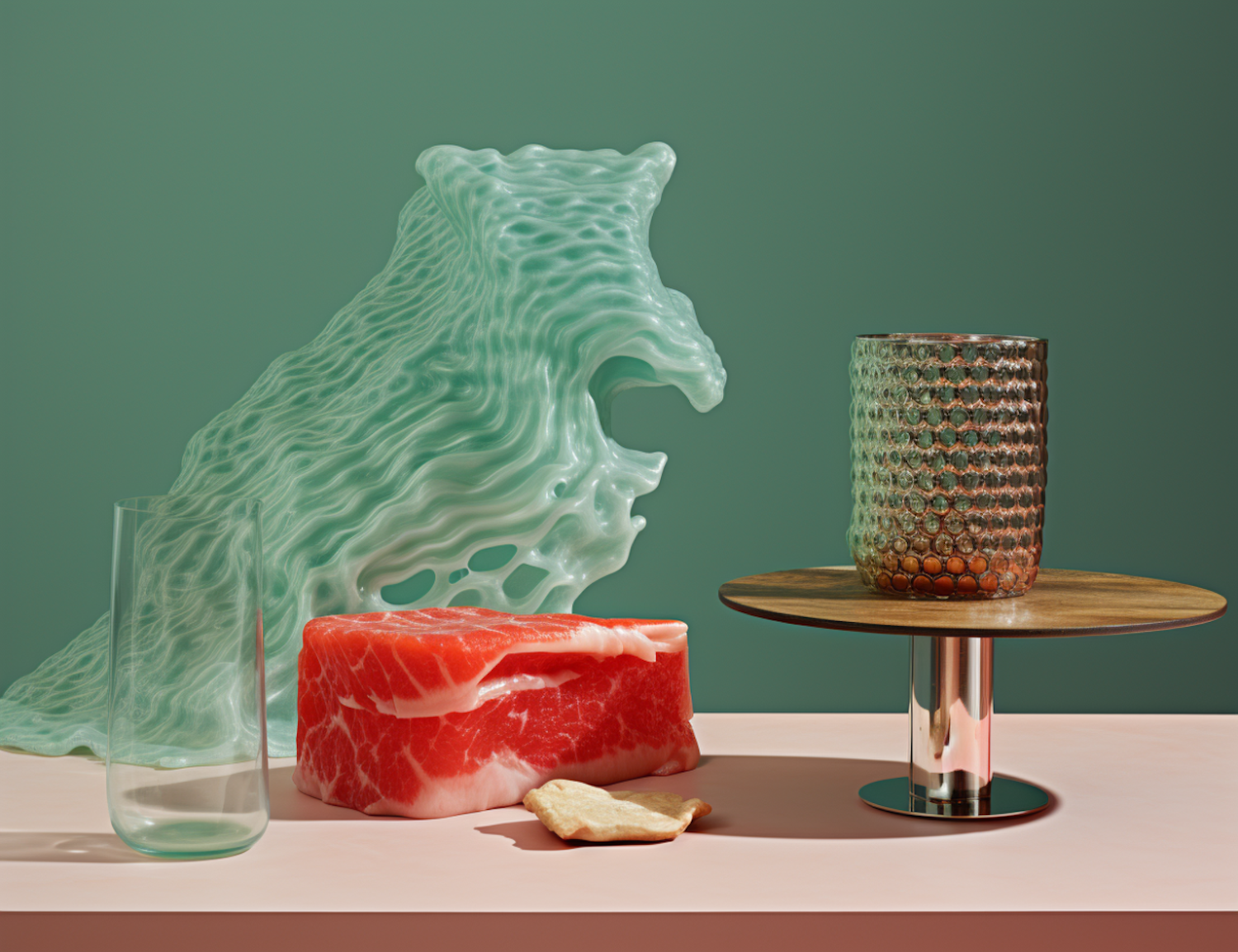 Artistic still life with raw salmon, textured glass, and sculptural green form on a pink surface against a green background.