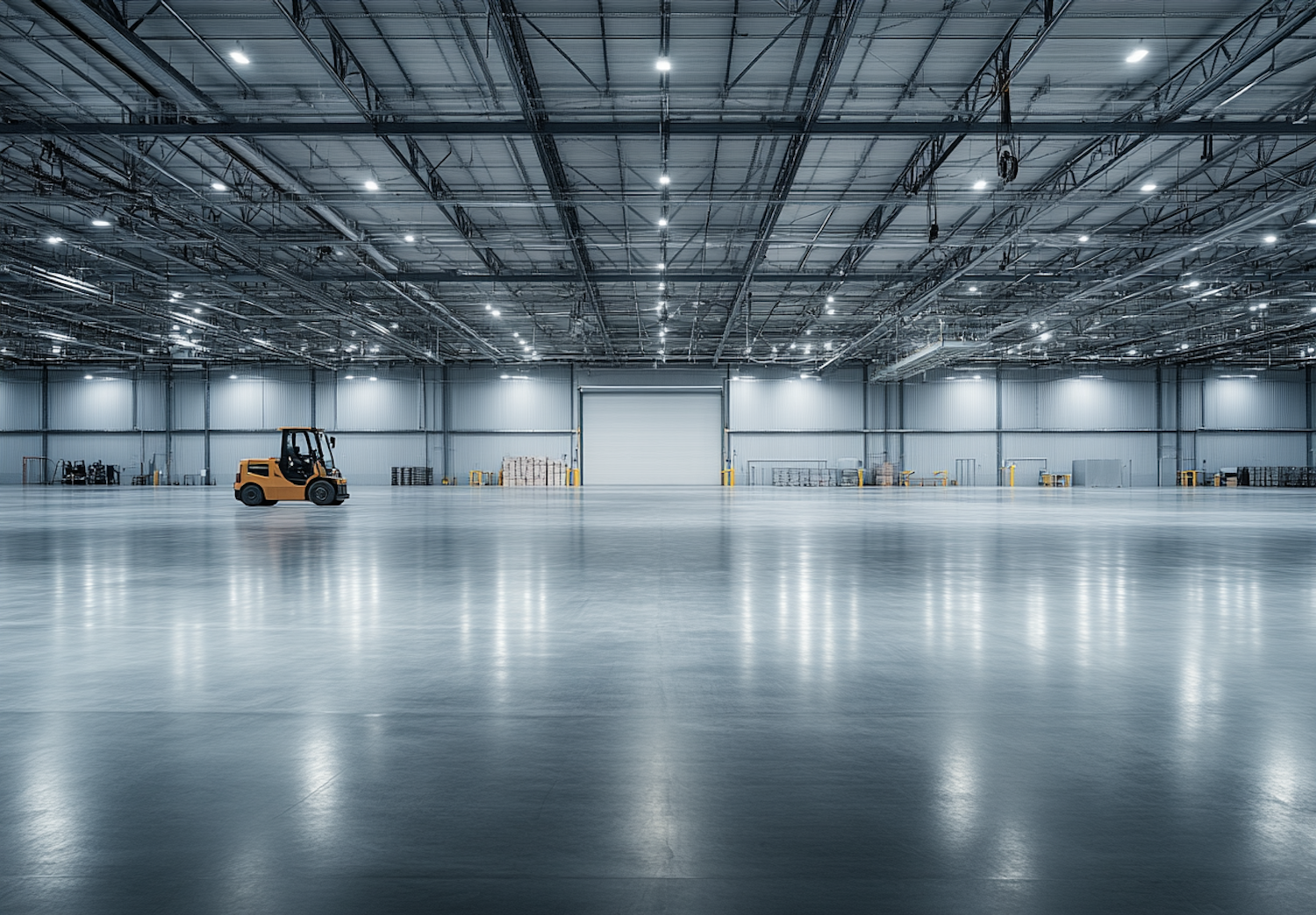 Spacious warehouse interior with a lone yellow forklift, reflective floors, and bright lighting, showcasing industrial efficiency.