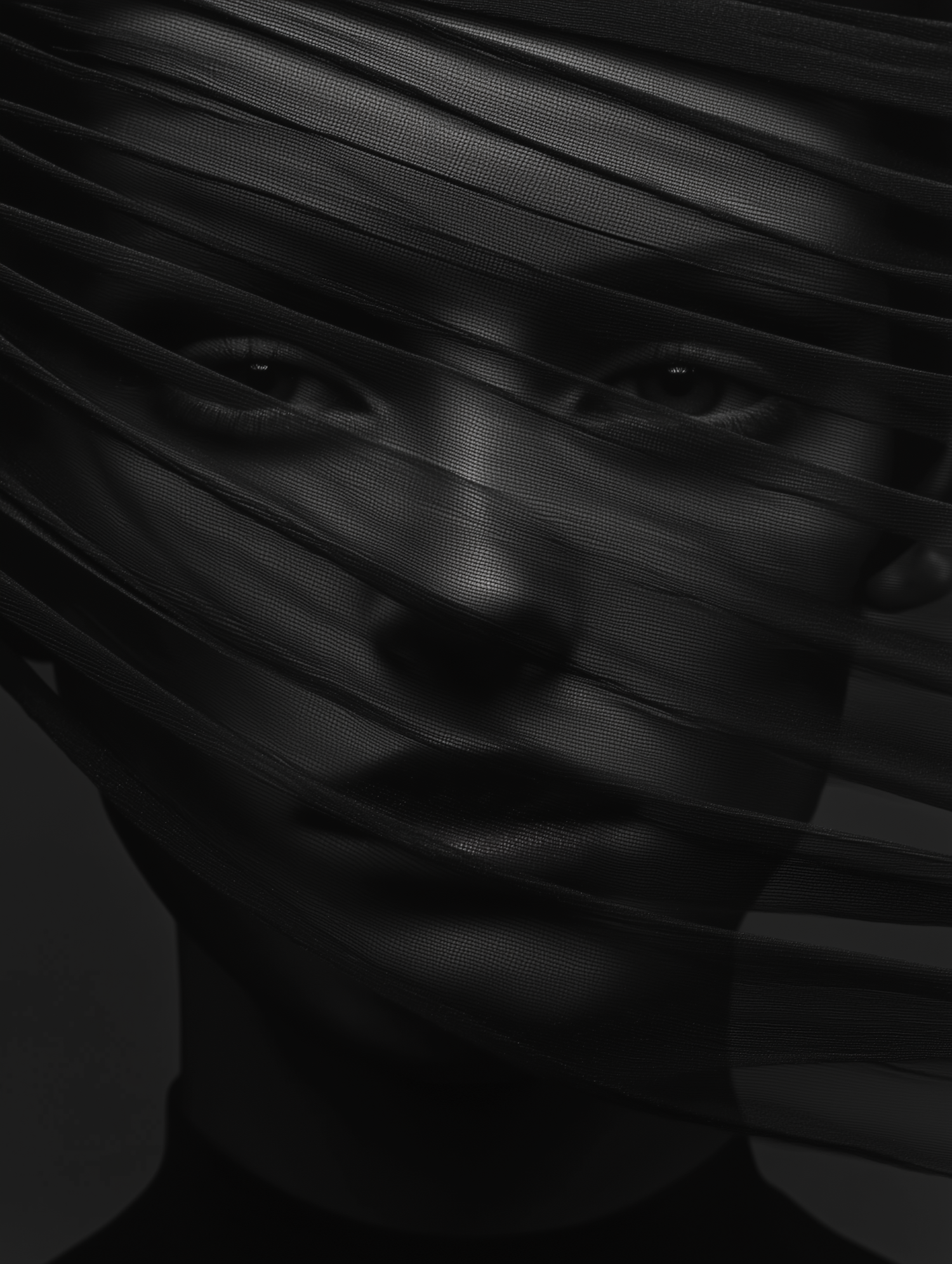 Monochromatic portrait with face obscured by sheer fabric, creating a mysterious and ethereal effect with subtle lighting and texture.