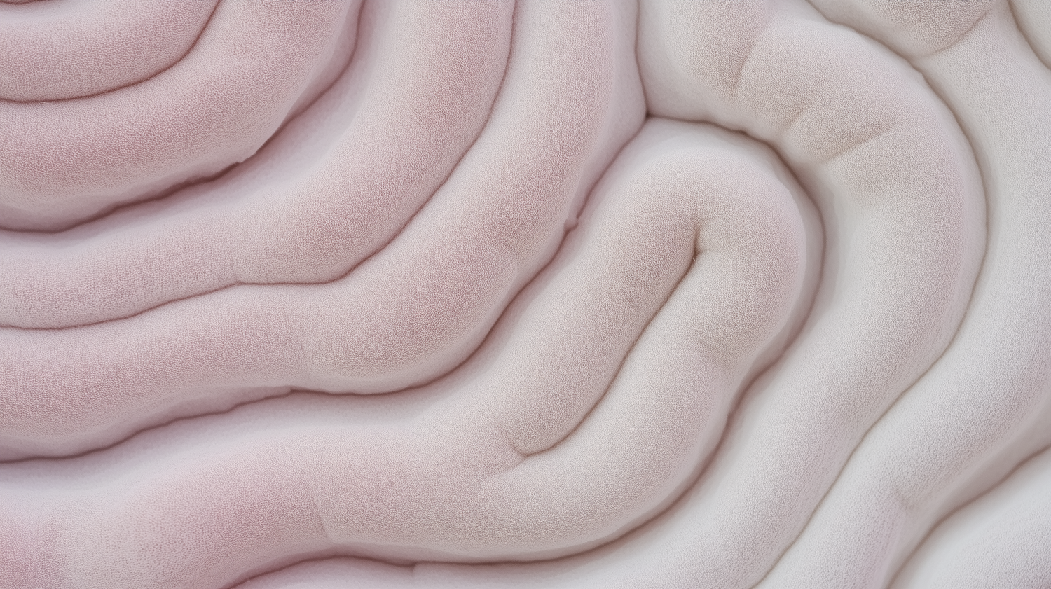 Close-up of soft, textured folds in pale pink and white, resembling plush or organic material with a soothing wave-like pattern.