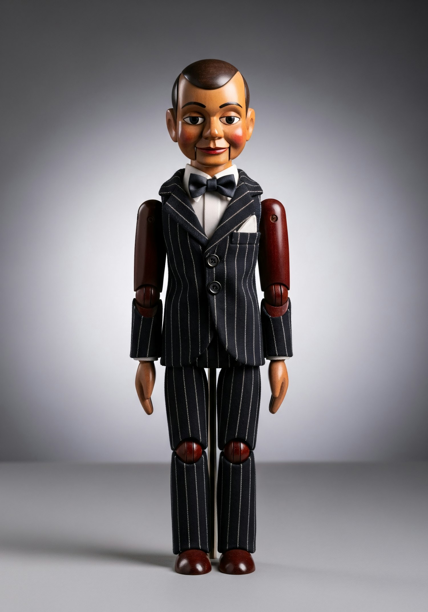A ventriloquist dummy in a pinstriped suit and bow tie, showcasing detailed craftsmanship and a lifelike painted expression.
