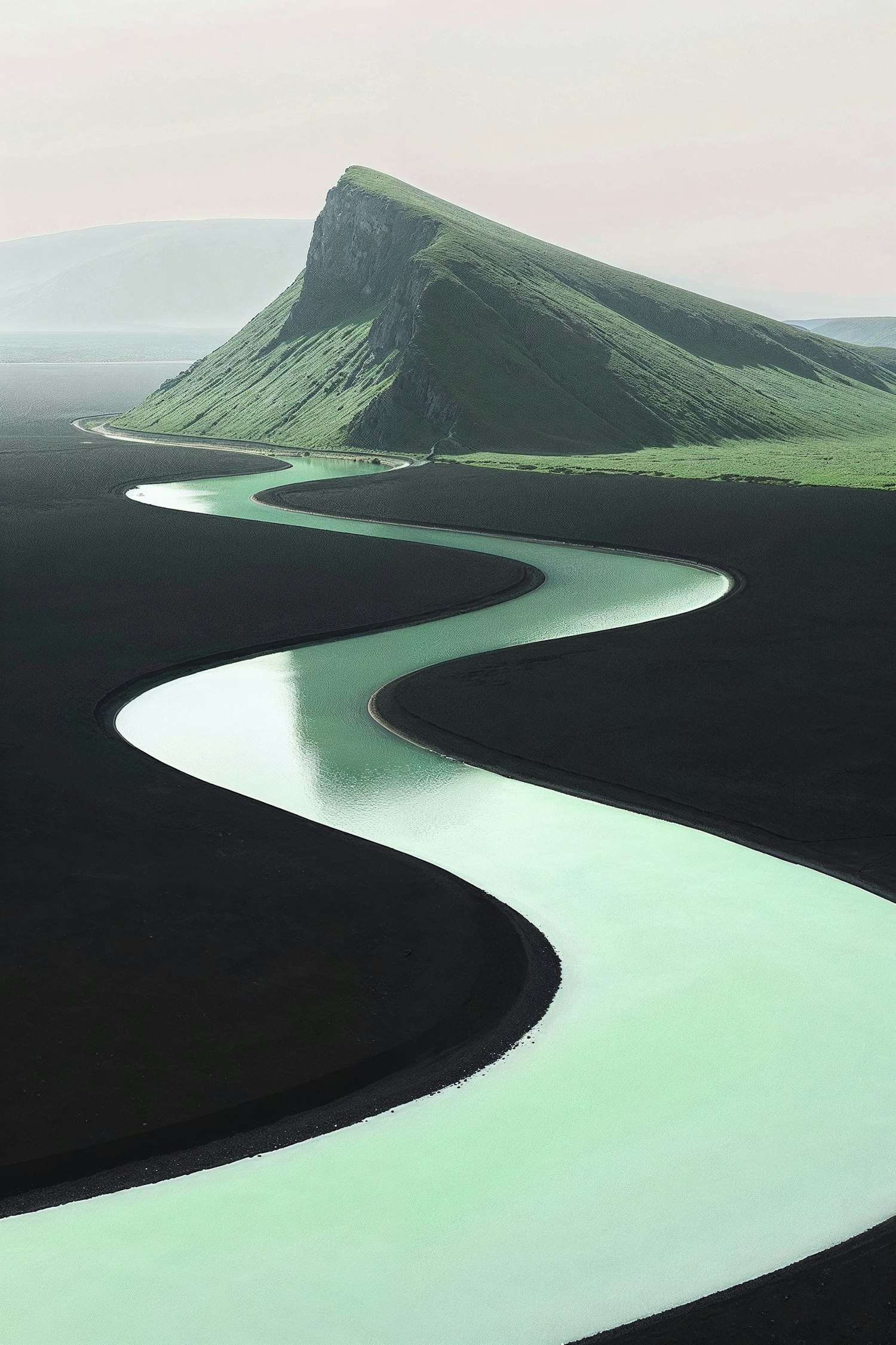 A winding pale green river flows through dark terrain, leading to a steep, grass-covered hill under an overcast sky.