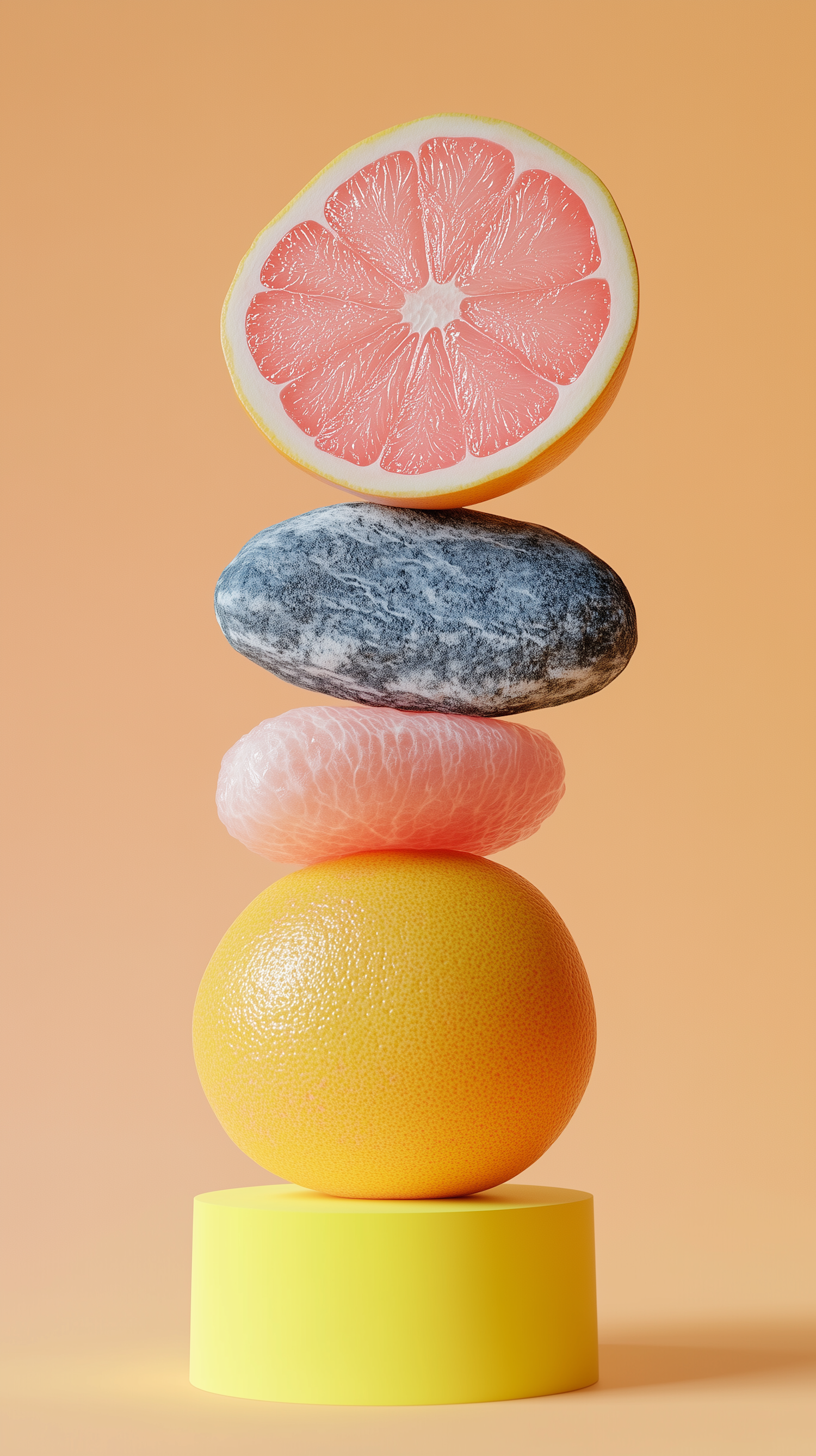 Artistic stack of grapefruit, stone, and pedestal against a soft orange background, showcasing vibrant colors and textures.