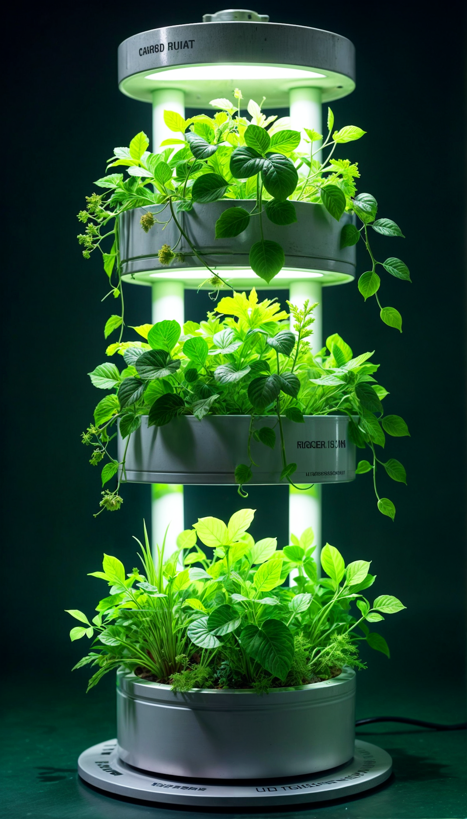 Vertical hydroponic garden with lush green plants under bright grow lights, perfect for indoor gardening enthusiasts.