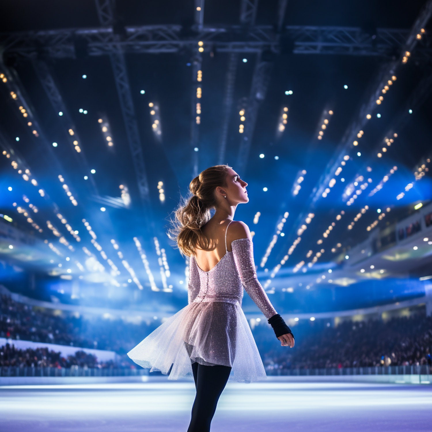 A figure skater in a sparkling dress stands on an ice rink, illuminated by bright lights, with a focused expression and a large audience.