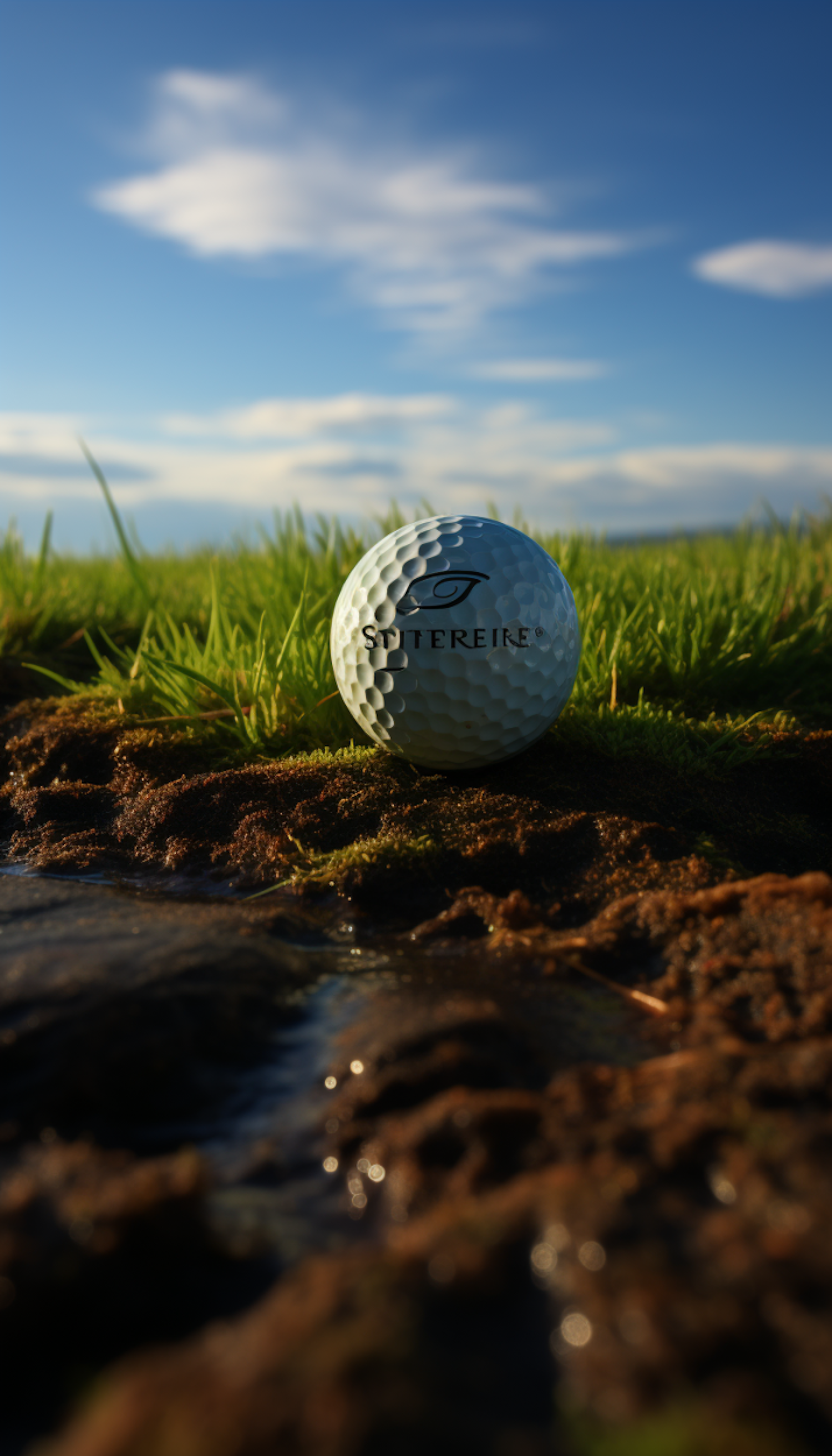 Close-up of a golf ball on grass with a stream, under a blue sky with clouds. Warm lighting highlights textures.
