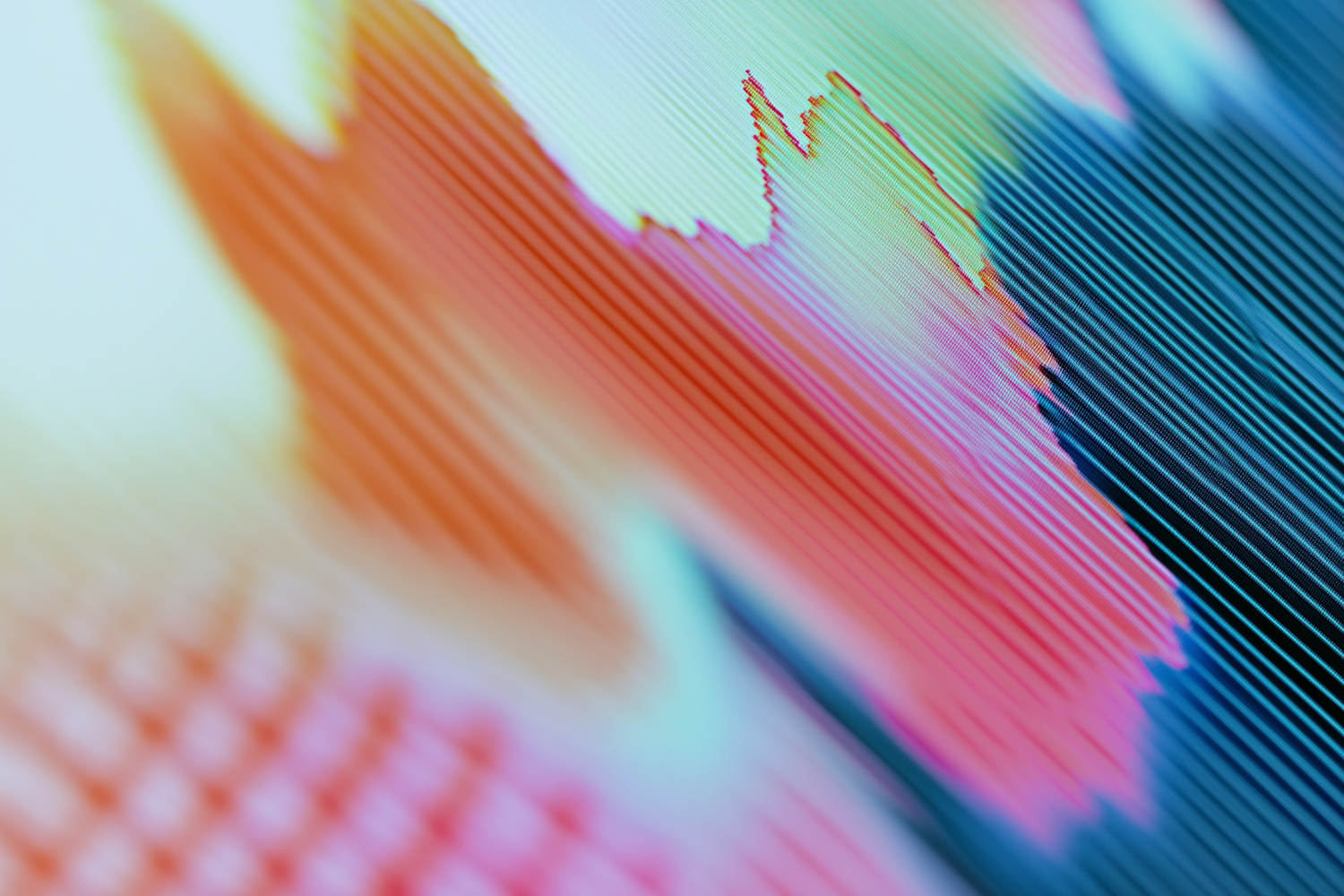 Abstract digital art with vibrant orange, pink, blue, and green hues, featuring diagonal lines and a glitch-like aesthetic.