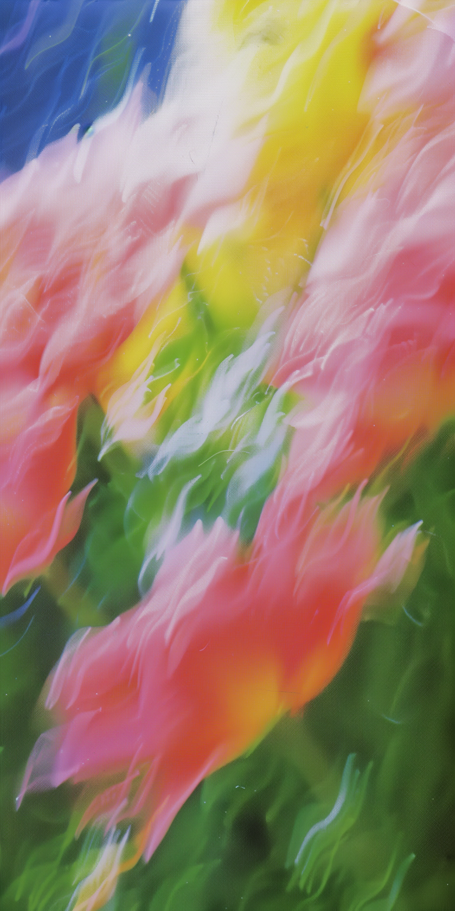 A colorful abstract artwork with swirling pink, yellow, green, and blue tones, evoking a vibrant floral and natural theme.