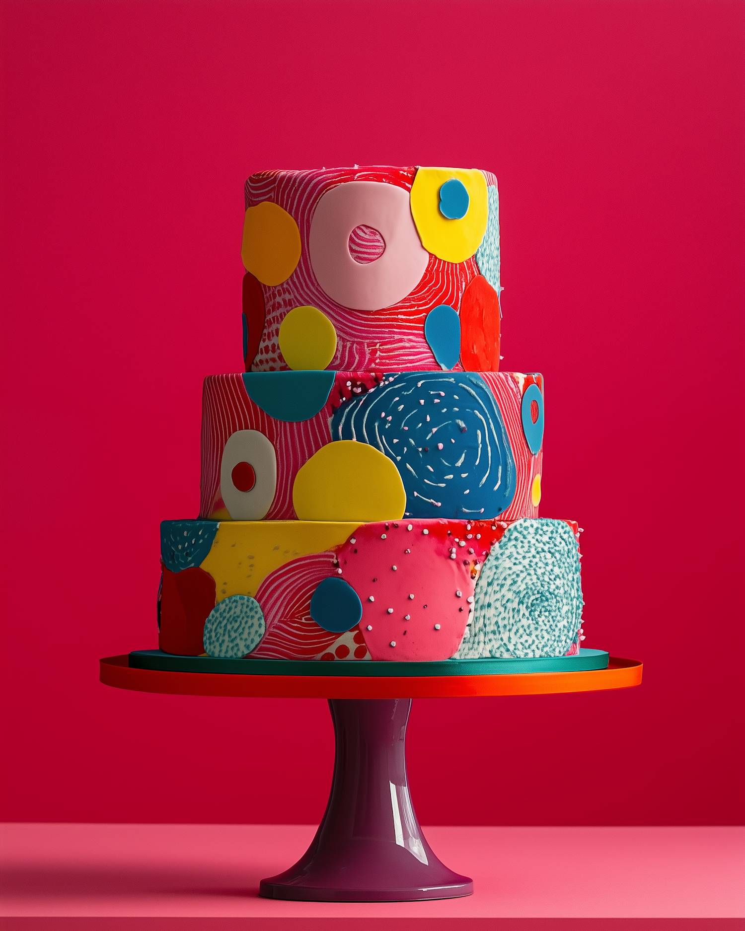 Colorful three-tiered cake with abstract patterns on a purple stand against a bold pink background.