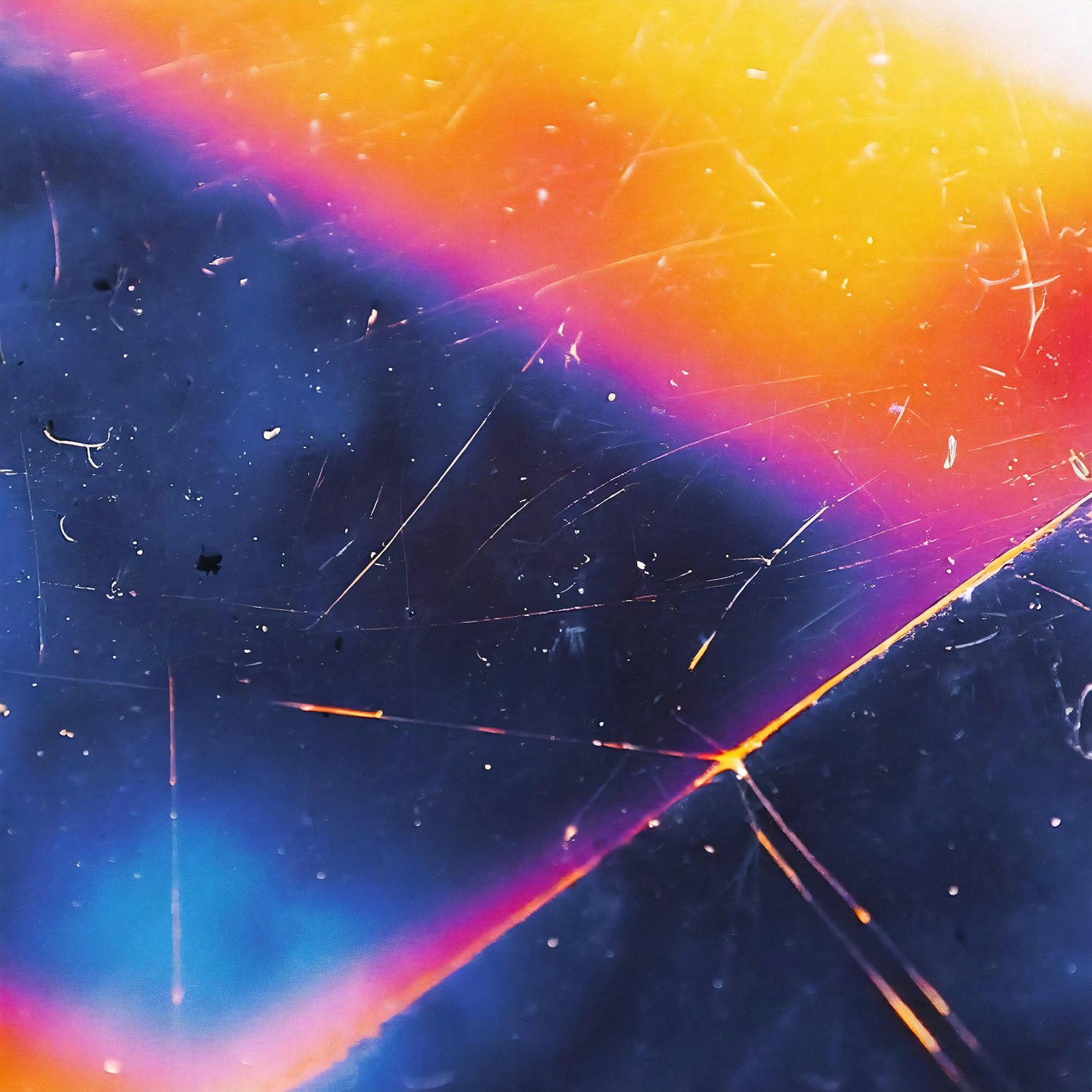 Abstract image with vibrant blue, orange, and magenta hues, intersecting light lines, and textured scratches for a dynamic effect.