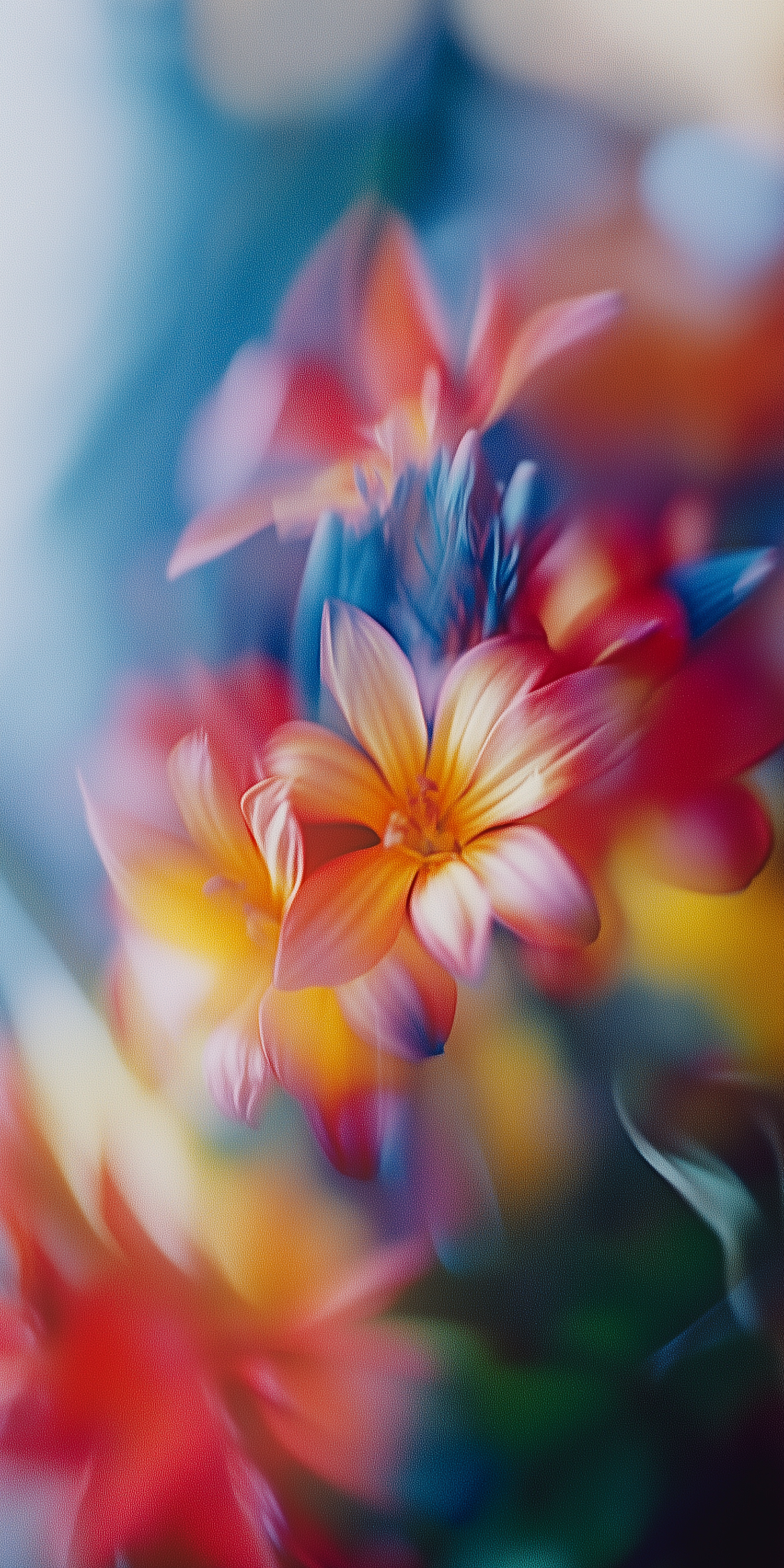 Abstract floral image with vibrant red, orange, and yellow hues, creating a dreamy, blurred effect with soft, delicate petals.