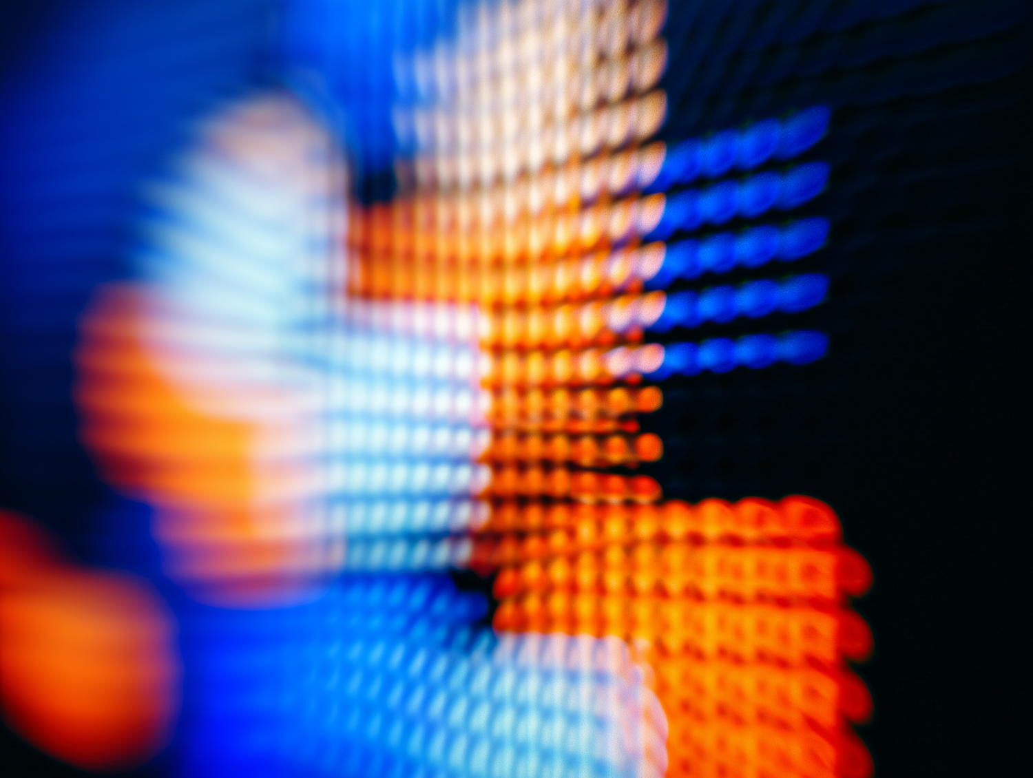 Abstract blurred grid of orange, blue, and white colors on a dark background, resembling a pixelated LED display.