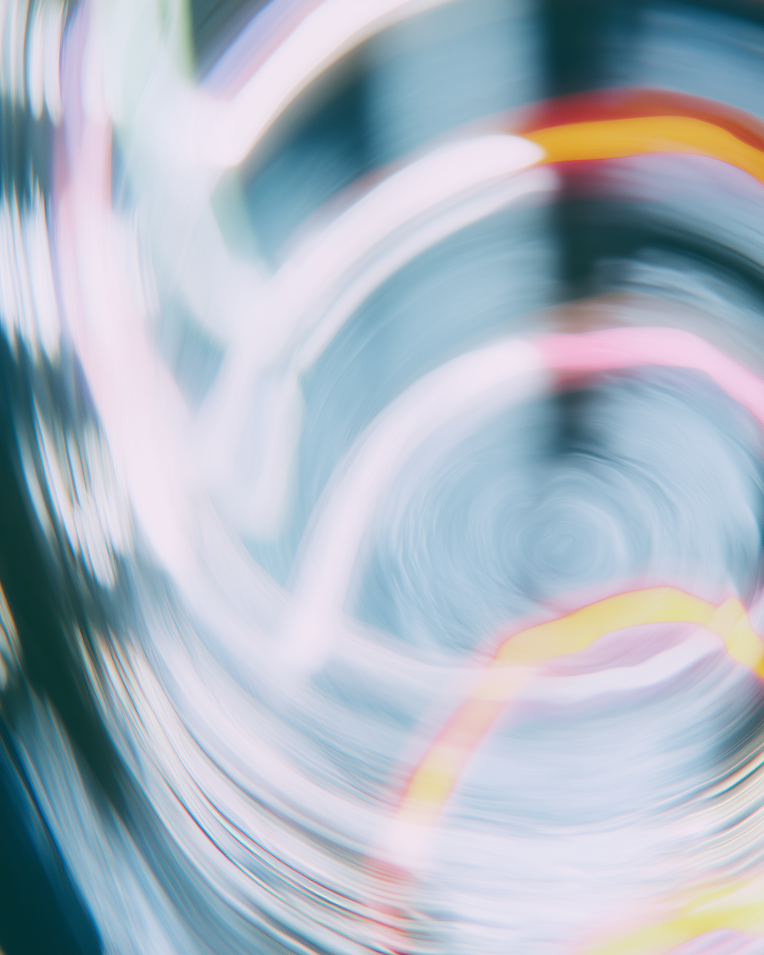 Abstract swirling patterns of light in blue, pink, yellow, and orange tones, creating a dynamic and dreamlike vortex effect.