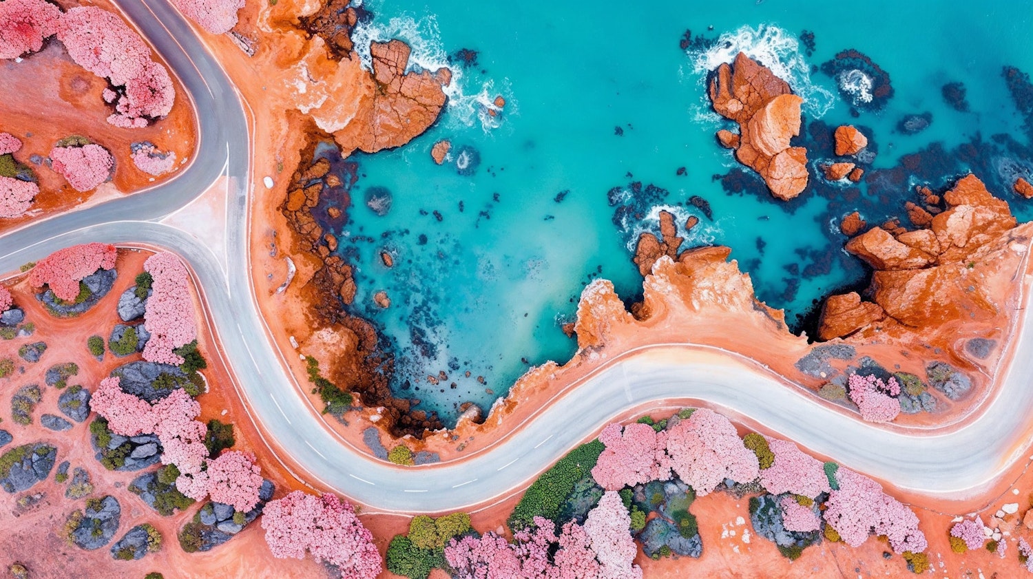 Aerial view of a winding coastal road with pink trees and turquoise waters, creating a vibrant and harmonious landscape.