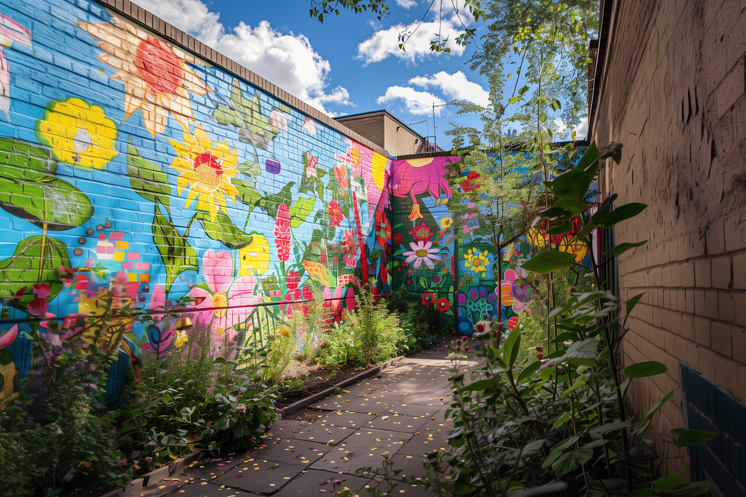 Colorful mural of flowers in a vibrant alleyway, blending art with nature under a bright blue sky.