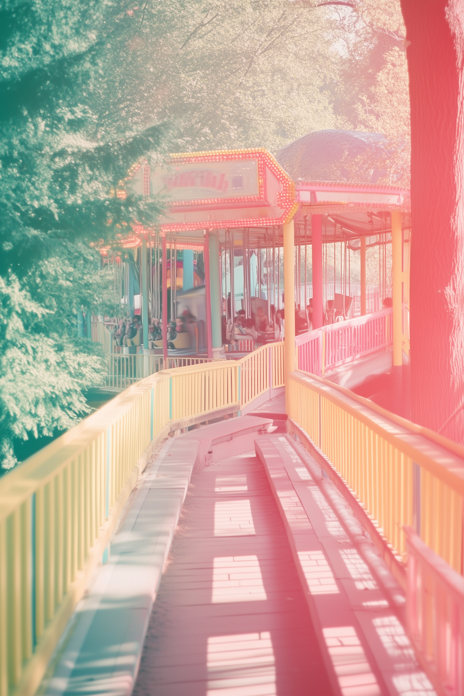 Dreamy pastel carousel scene with soft pink and teal hues, featuring a winding path and nostalgic amusement park vibes.