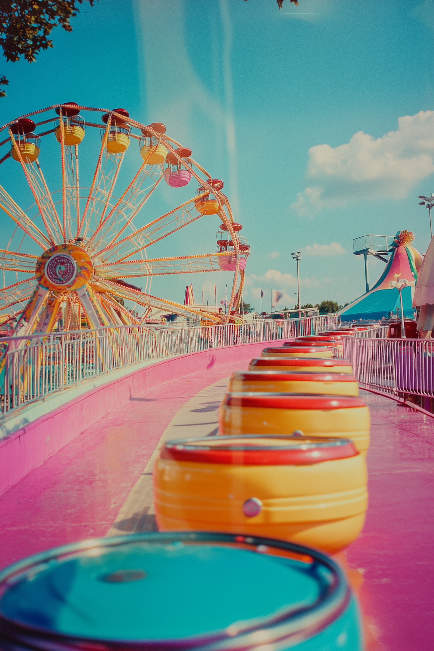 Colorful amusement park with a Ferris wheel and vibrant barrels under a bright blue sky. Perfect for a fun day out!