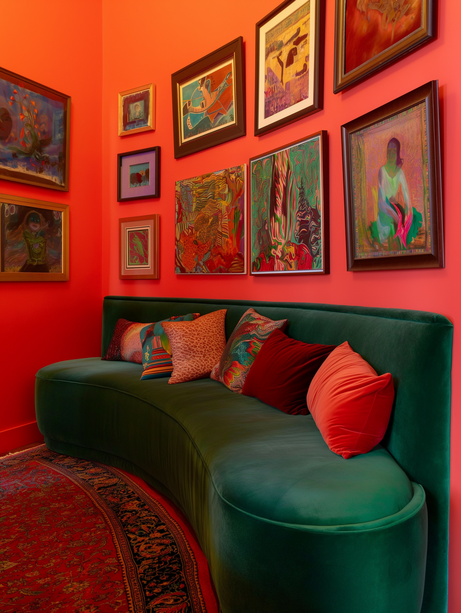 Vibrant room with orange walls, eclectic artwork, a green velvet sofa, colorful pillows, and a patterned rug.