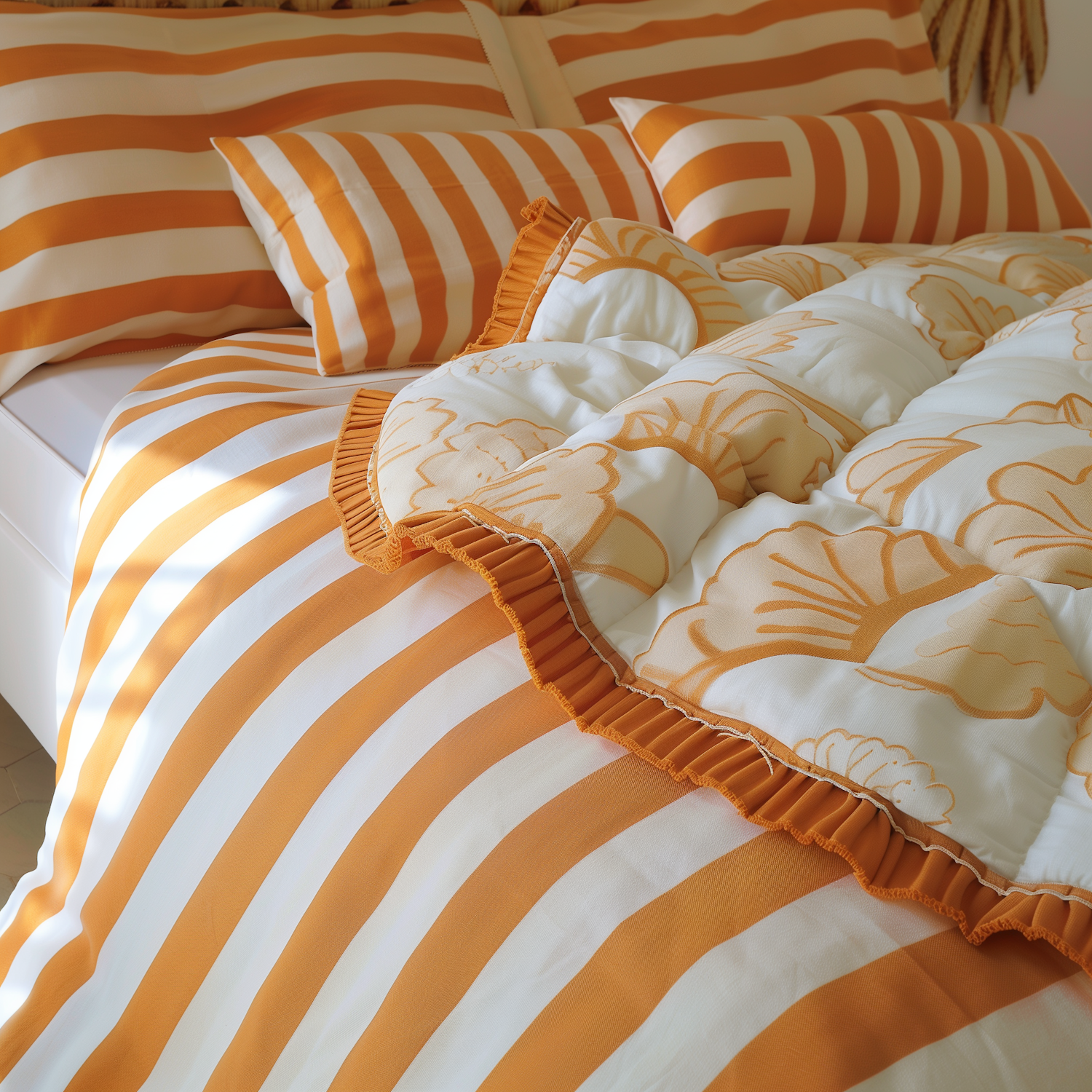Vibrant orange and white striped bedding with floral quilt and ruffled edges, creating a cozy and cheerful bedroom atmosphere.