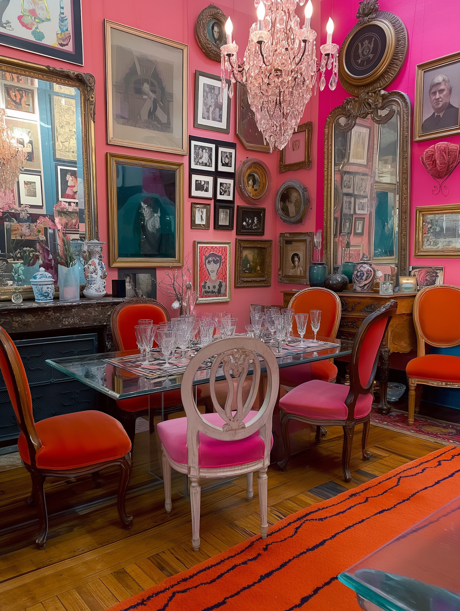Vibrant dining room with pink walls, eclectic art, crystal chandelier, and colorful chairs. A bold, artistic space full of character.