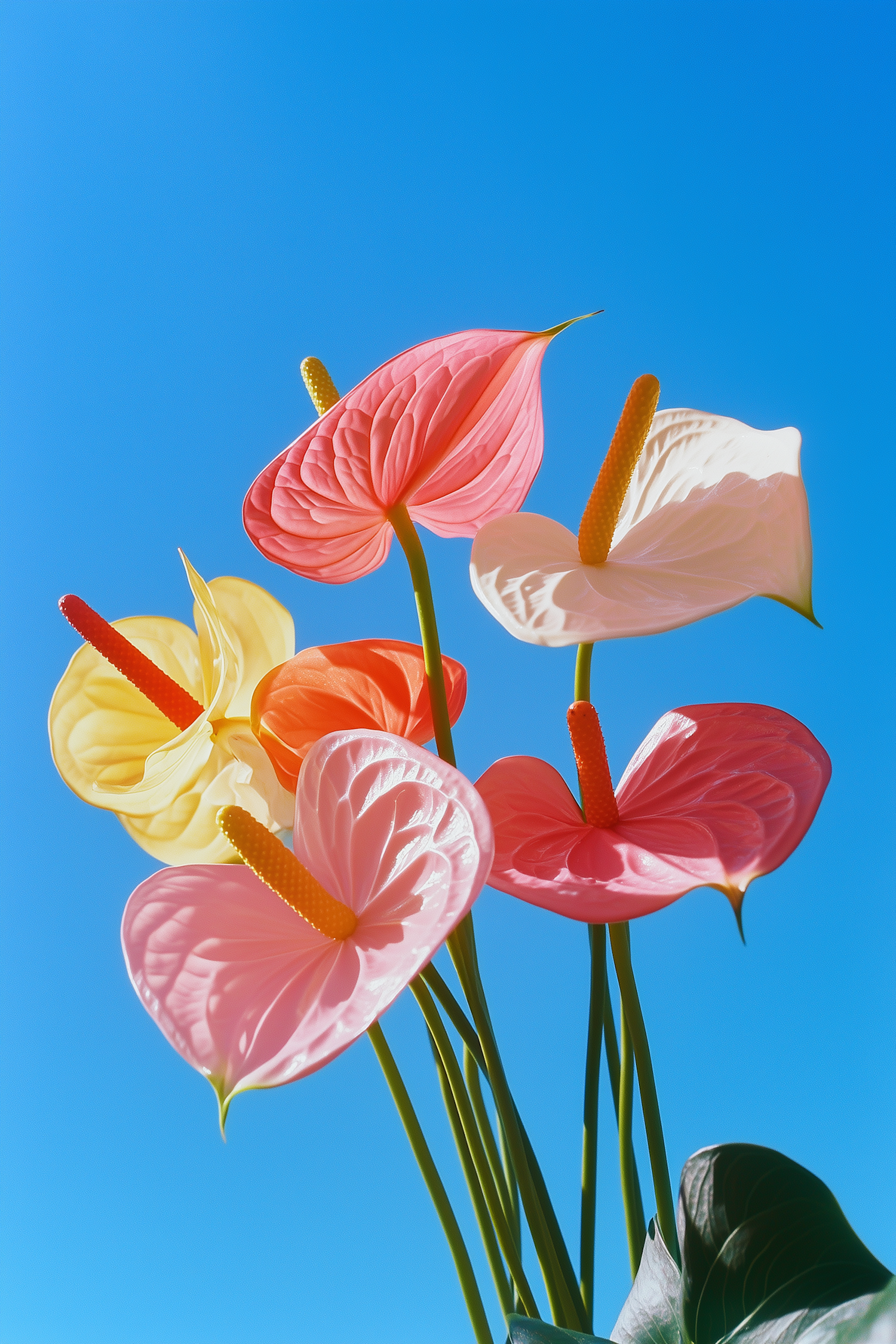 Bright anthurium flowers in pink, red, yellow, and white pop against a clear blue sky, creating a vibrant and cheerful scene.