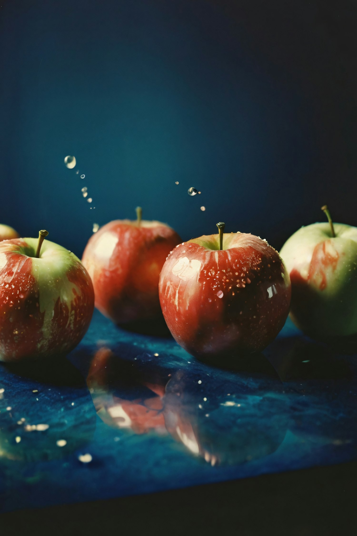 Vibrant apples with water droplets on a reflective blue surface, creating a fresh and dynamic visual appeal.