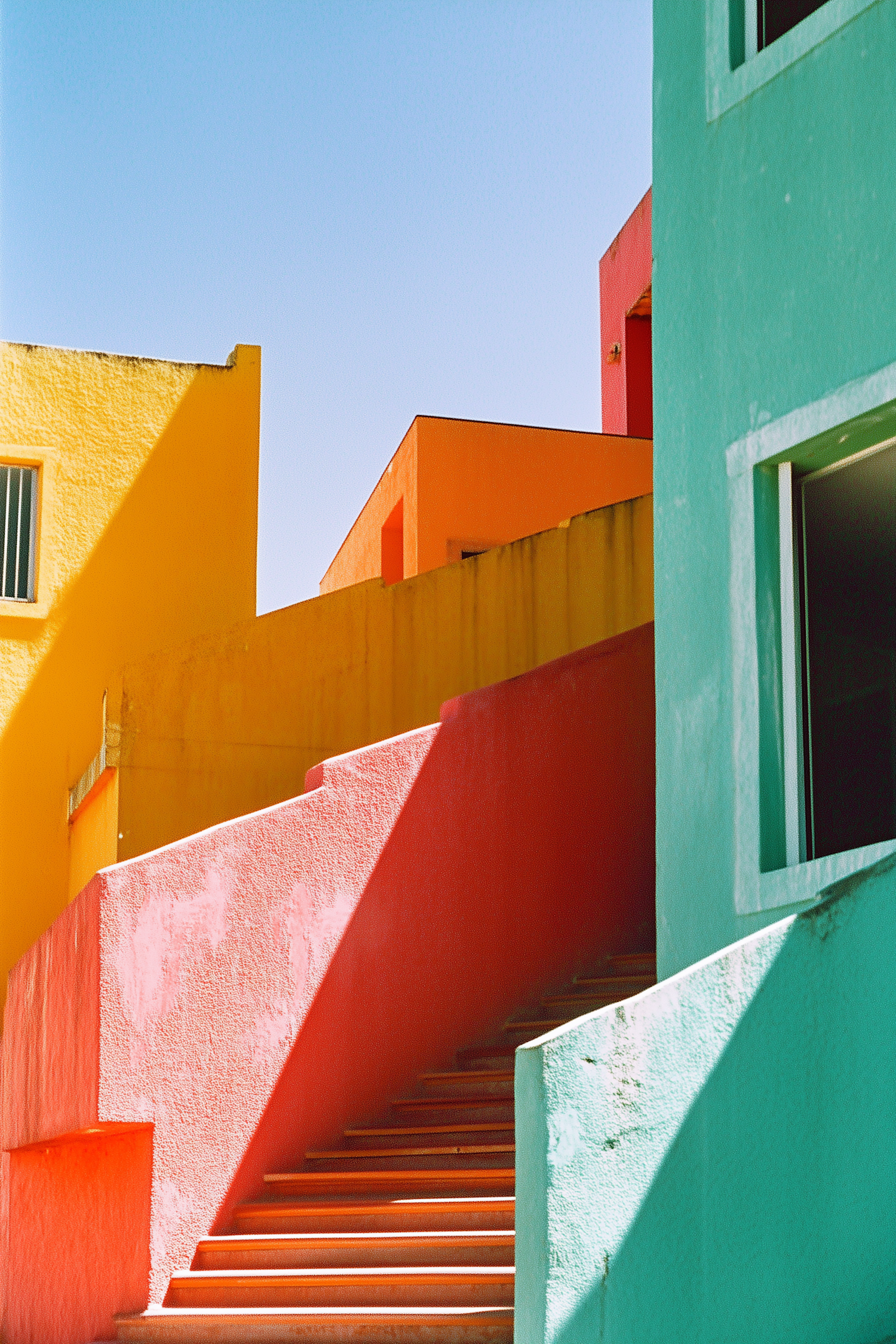 Brightly colored geometric buildings with yellow, red, teal, and orange hues under a clear blue sky, featuring a red staircase.