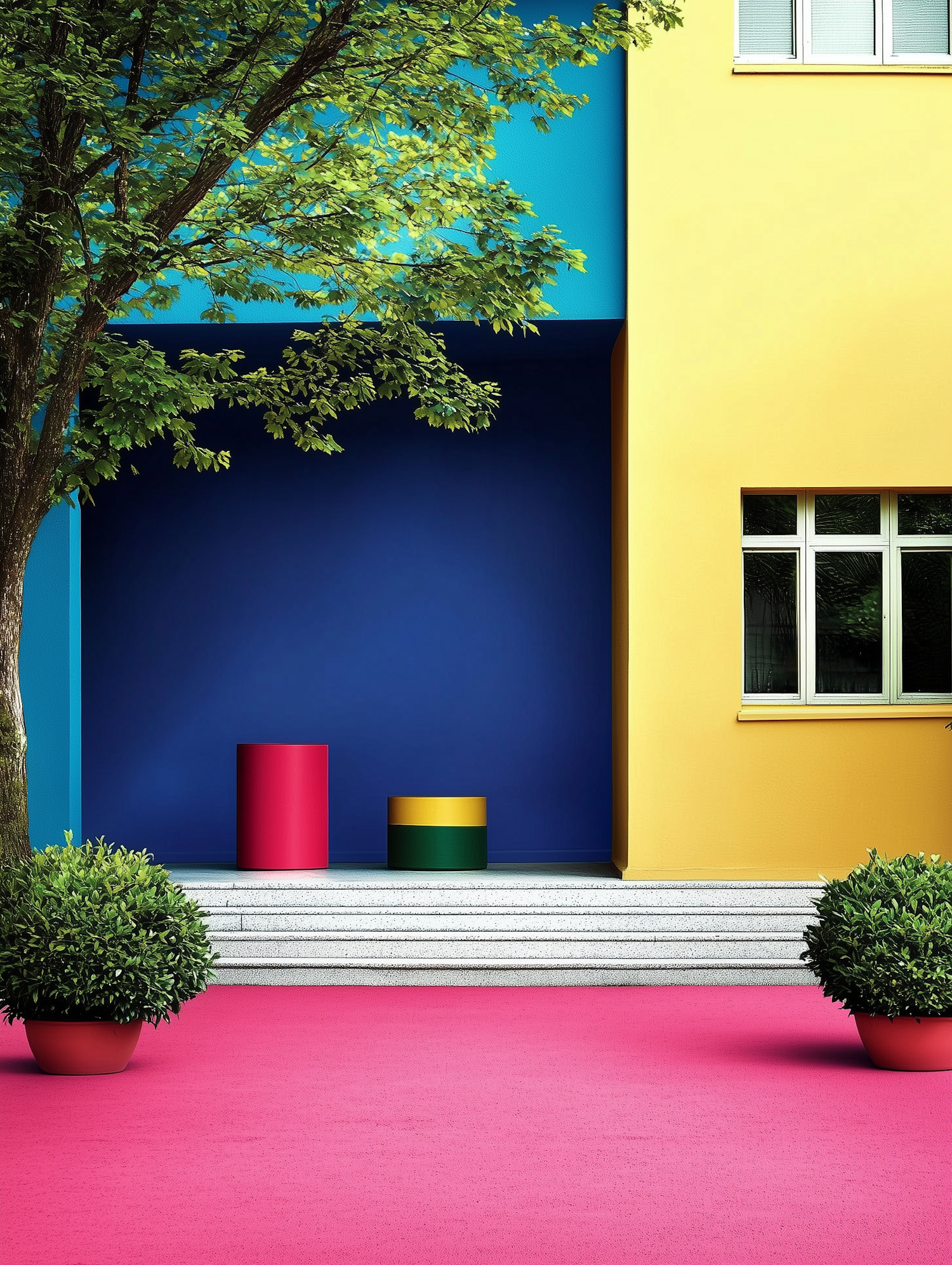 Vibrant architectural scene with bold colors: yellow facade, blue inset, pink ground, and colorful cylindrical objects.