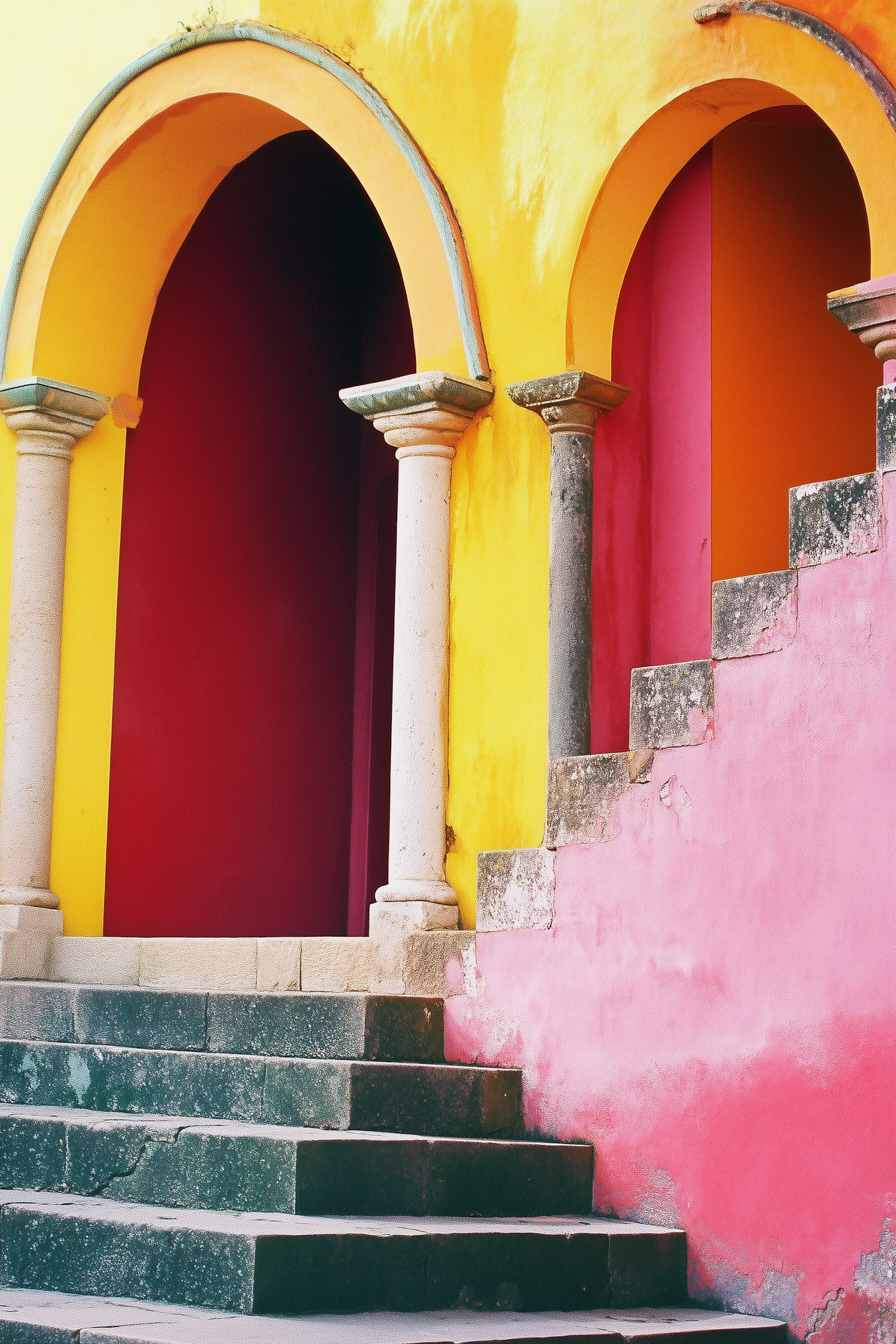 Colorful architectural scene with yellow arches, red and orange walls, and stone steps. Vibrant and dynamic composition.