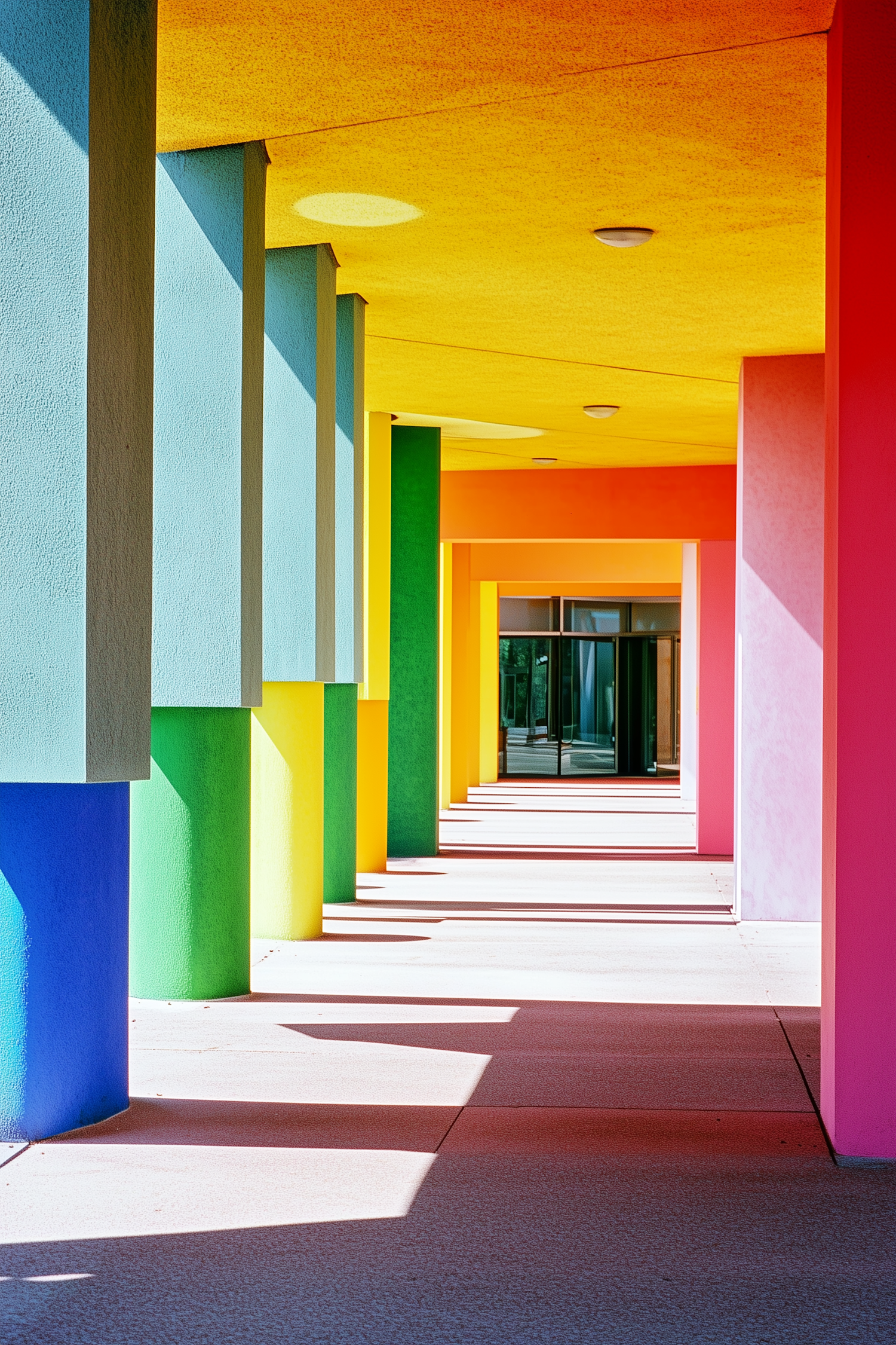 Colorful corridor with rainbow columns and bright yellow ceiling, leading to a glass door. Vivid colors and geometric patterns create depth.