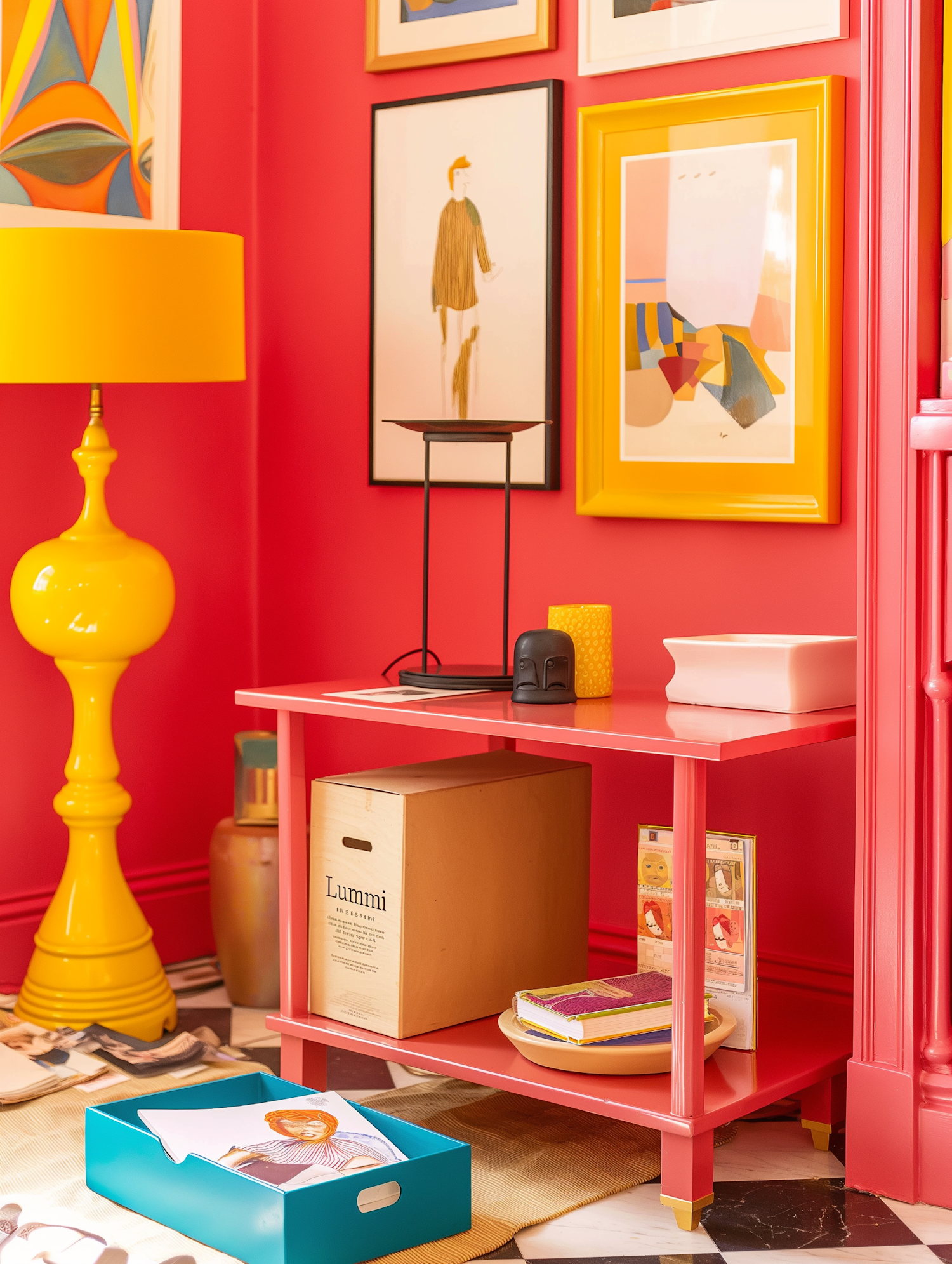 Vibrant room with red walls, colorful art, a yellow lamp, and a red shelf holding eclectic decor. Artistic and lively interior design.