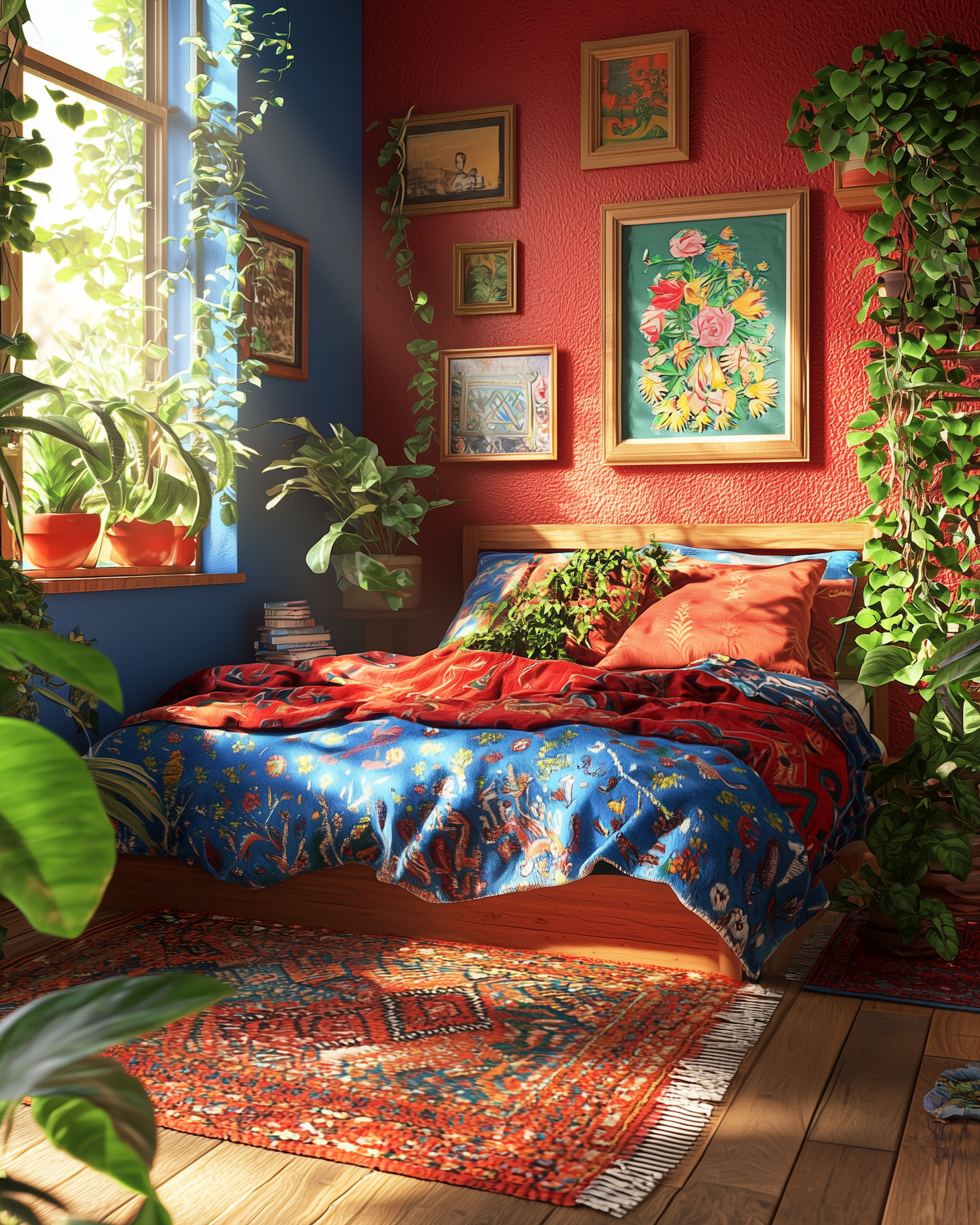 Bright, cozy bedroom with vibrant red and blue walls, lush plants, colorful bedding, and eclectic artwork. Perfect for a warm, artistic vibe.