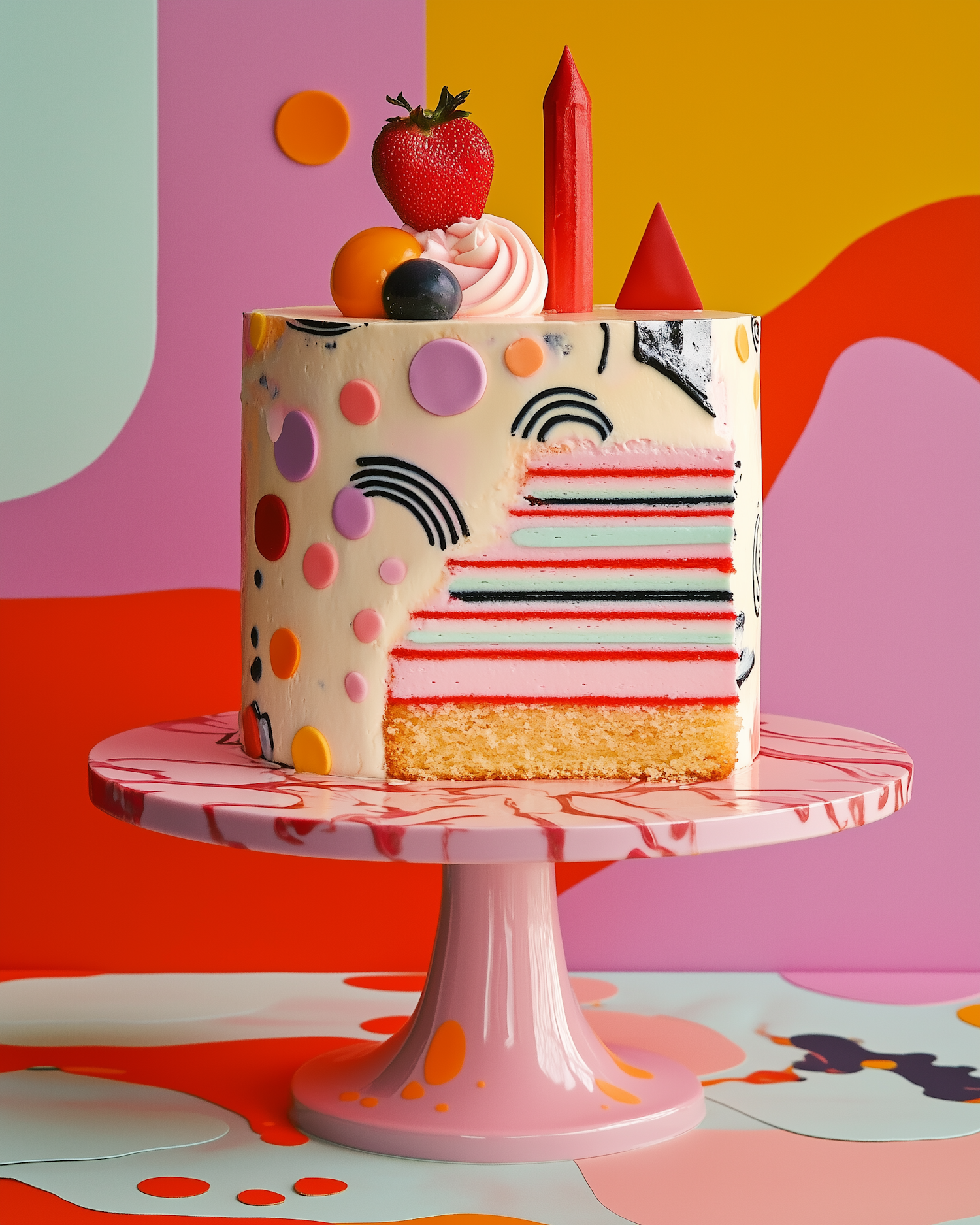 Colorful geometric cake with layers and a strawberry on top, set against a vibrant background. Perfect for modern dessert lovers.