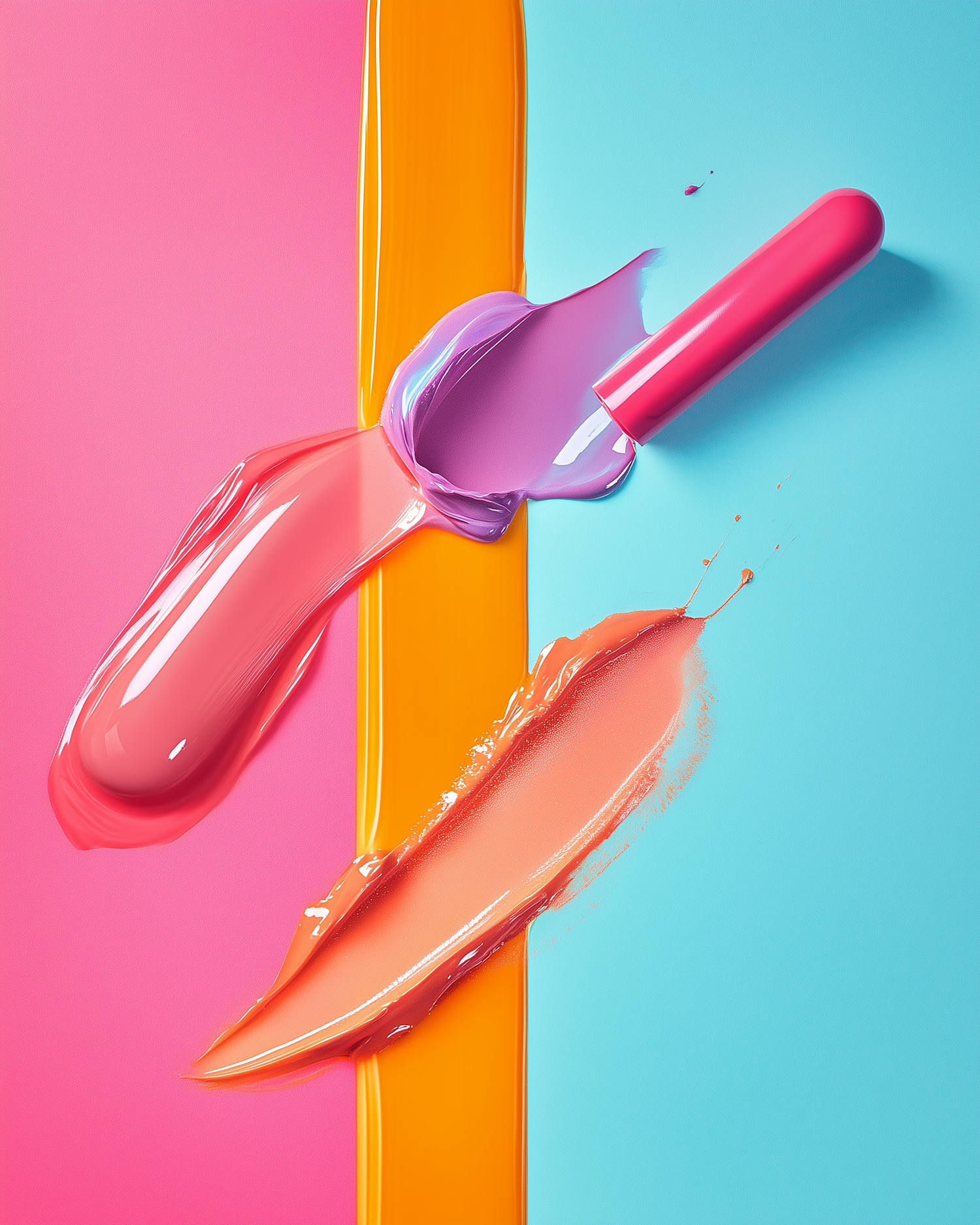 Vibrant paint strokes and a brush on a colorful background, featuring pink, blue, orange, and purple hues.