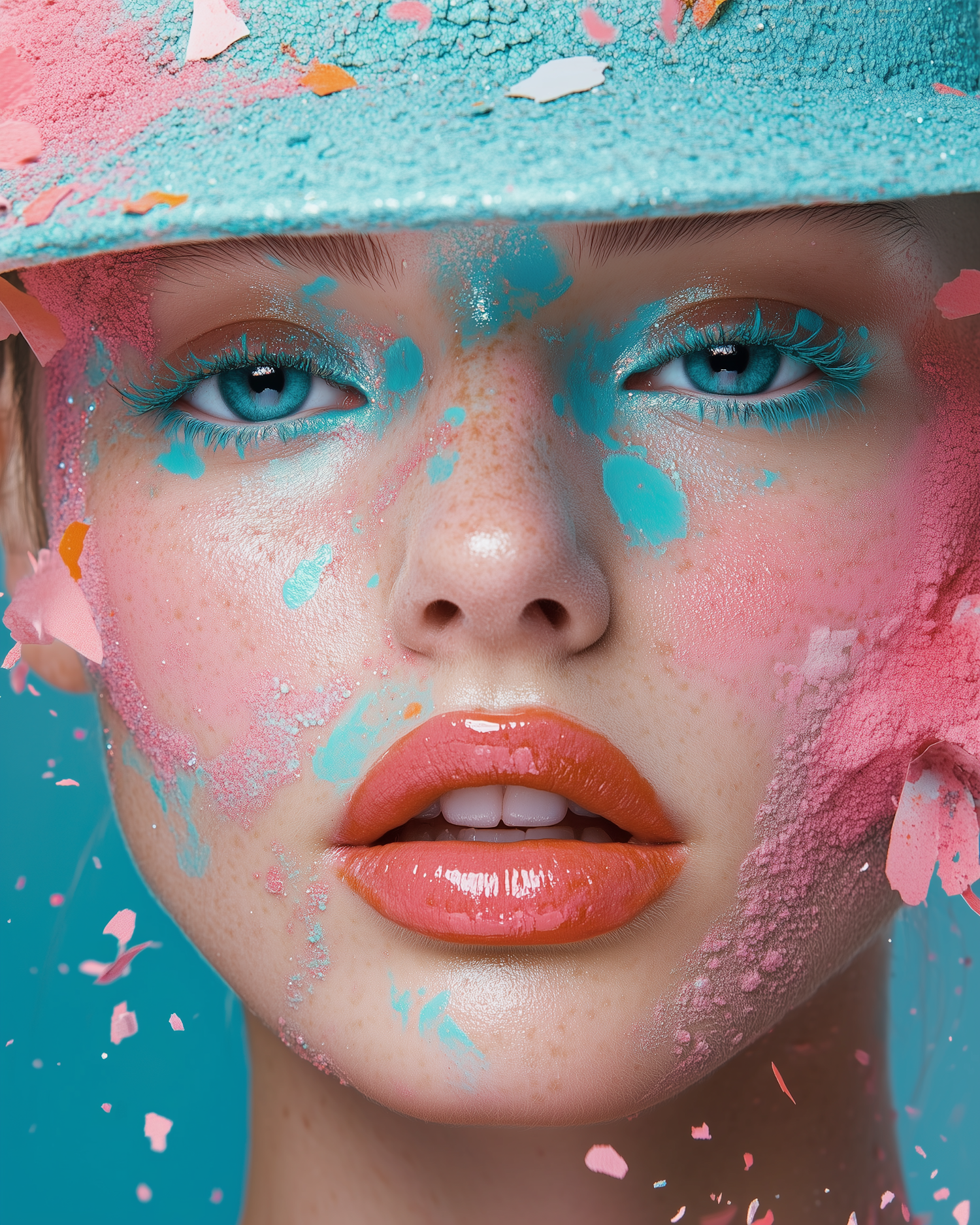 Vibrant close-up portrait with turquoise and pink paint, glossy coral lips, and a textured hat, creating a dynamic artistic effect.