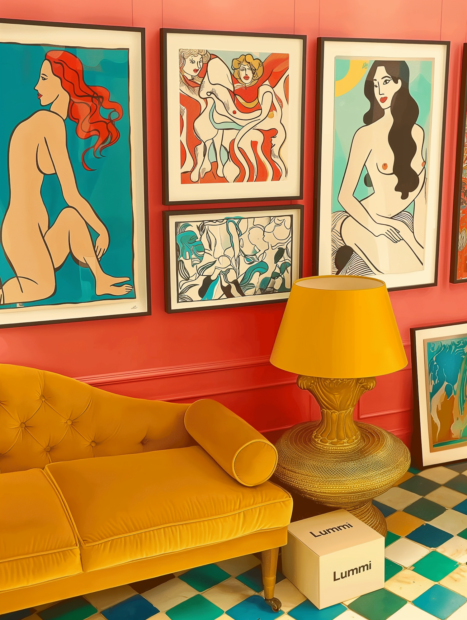 Vibrant art gallery with colorful abstract paintings, a mustard yellow sofa, and a bold coral pink wall.