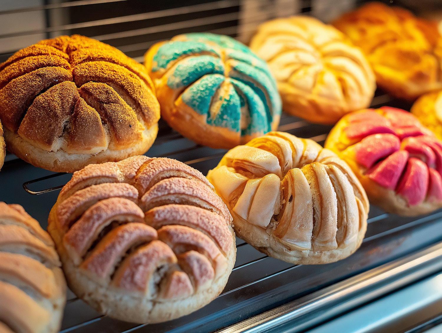 Colorful conchas on a rack, showcasing vibrant patterns and textures of Mexican sweet bread.