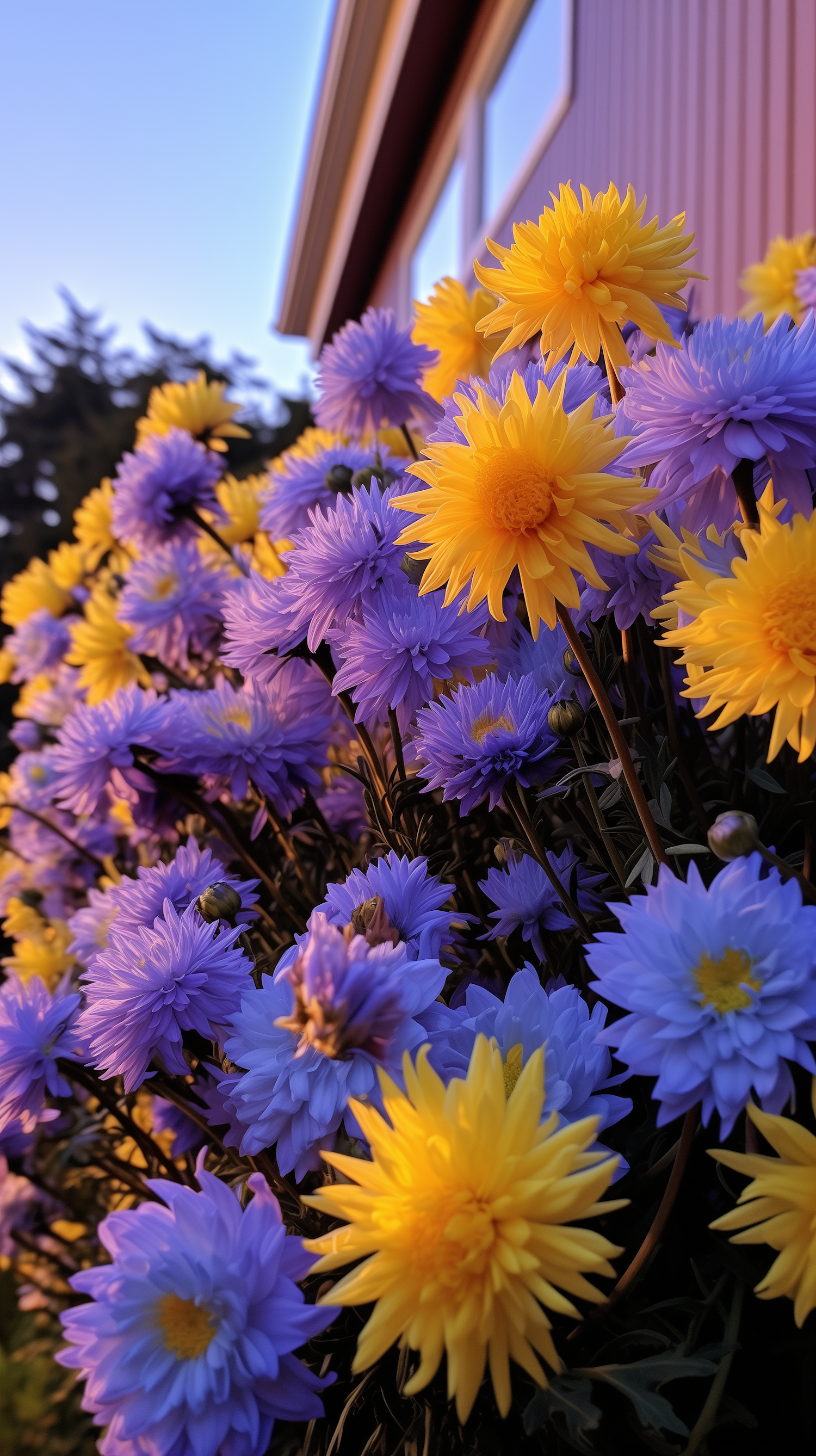Vibrant yellow and purple flowers in full bloom under a clear blue sky, with sunlight enhancing their vivid colors.