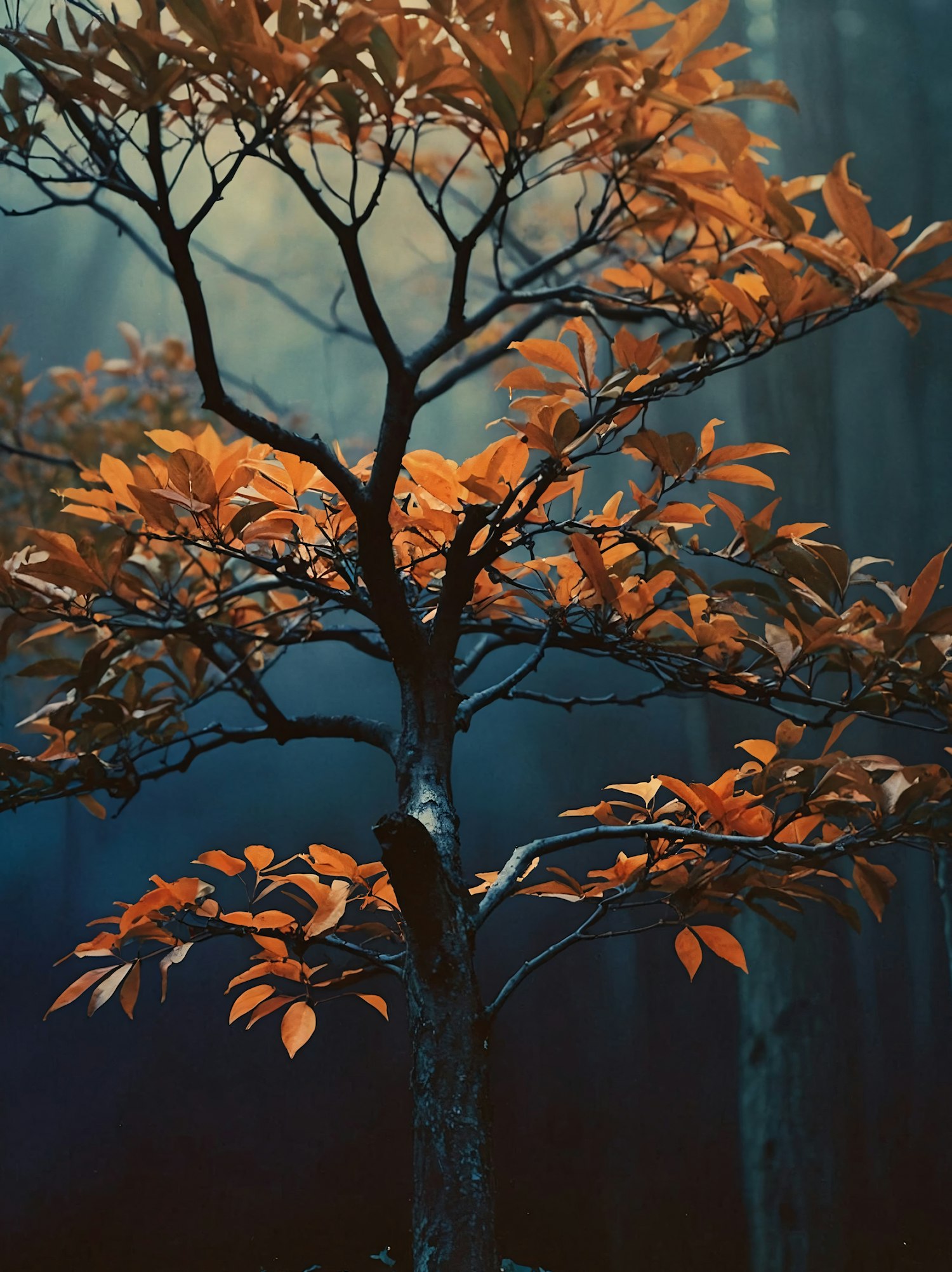 A tree with vibrant orange leaves stands out against a dark, mysterious forest background, creating a striking contrast.
